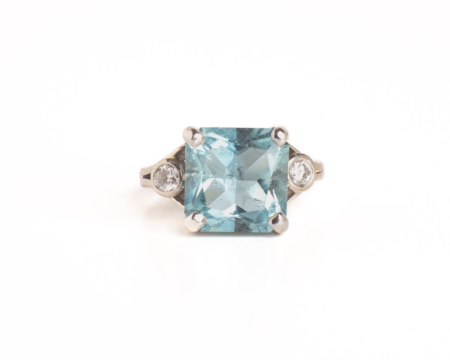 Elegancki pierścionek z białego złota z centralnie położonym, bardzo dużym akwamarynem. Po jego obu stronach ulokowane są diamenty, o łącznej masie 0, 20 ct.