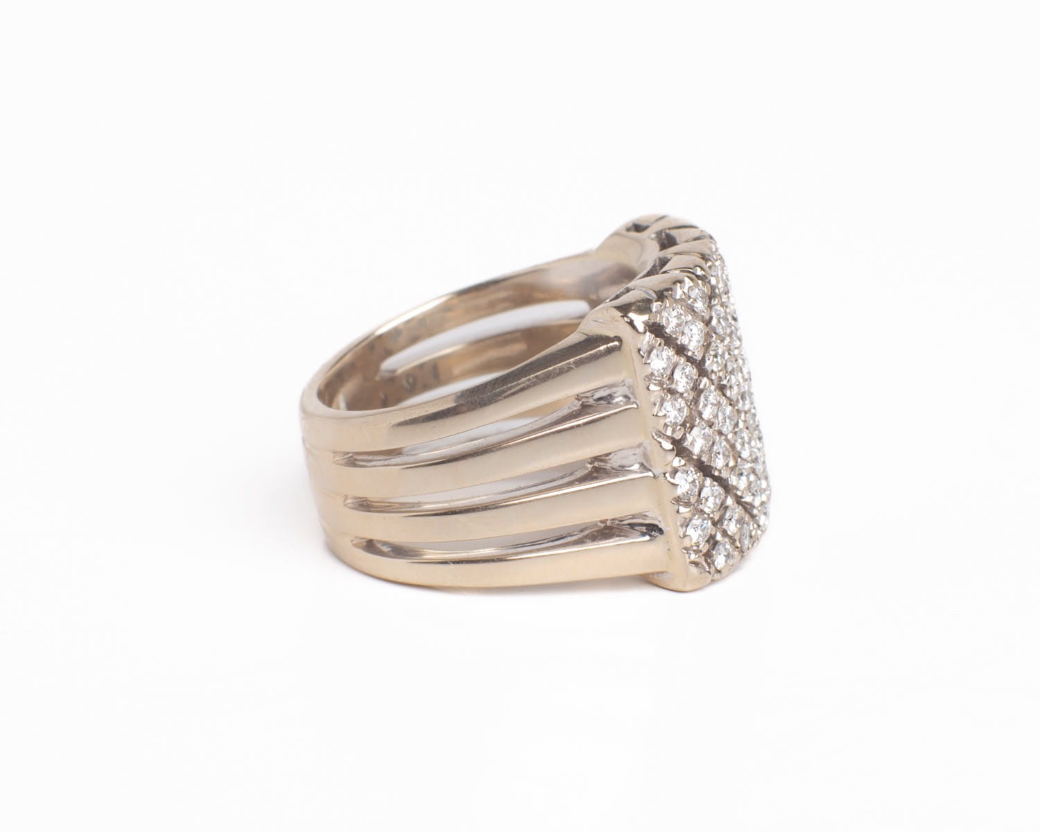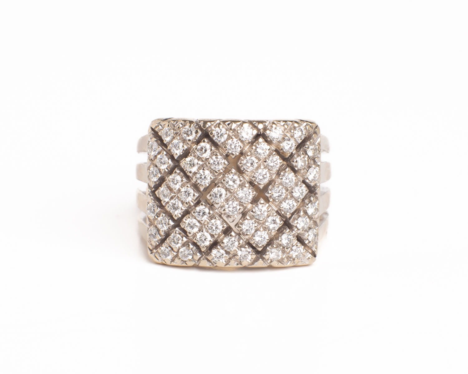 Pierścionek z białego złota próby 2/750 wysadzany dużą ilością diamentów.