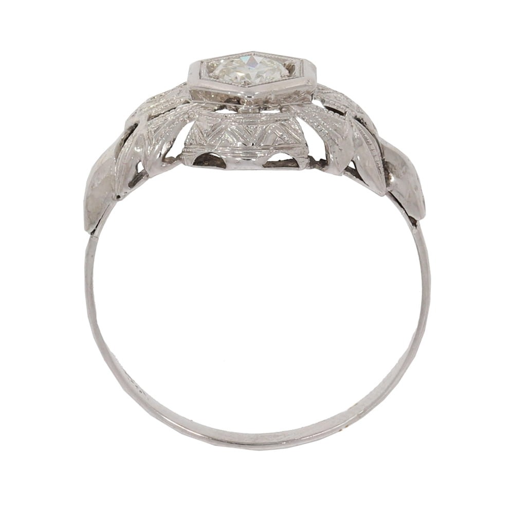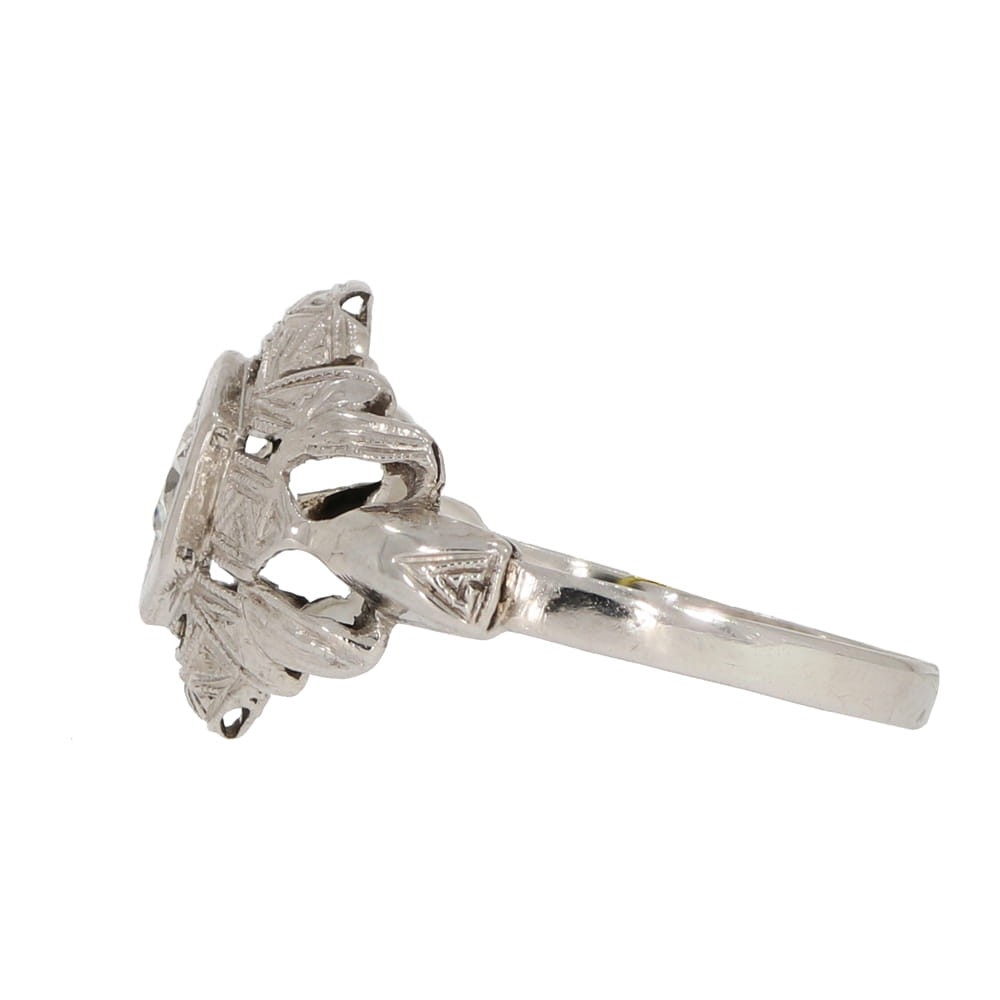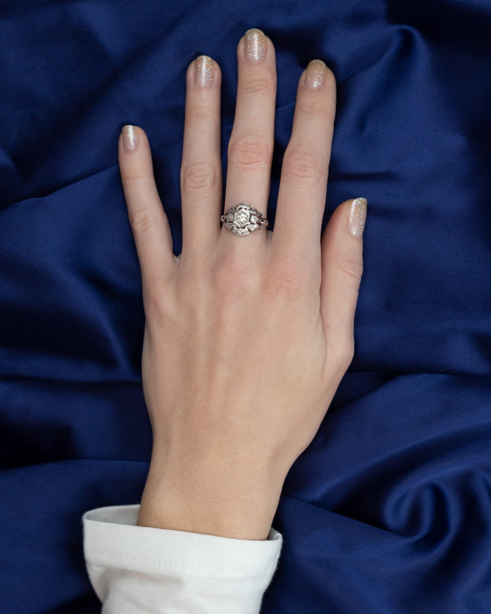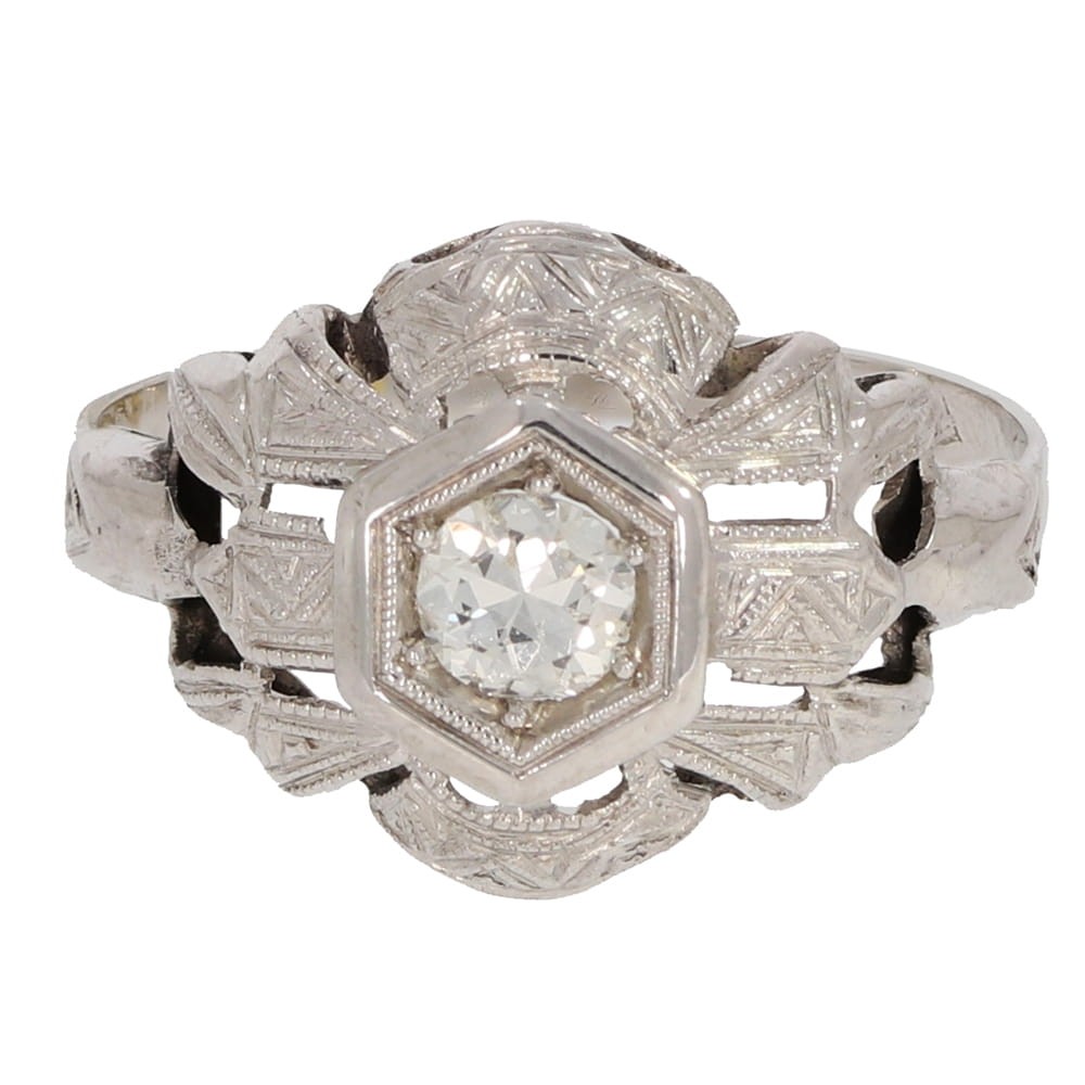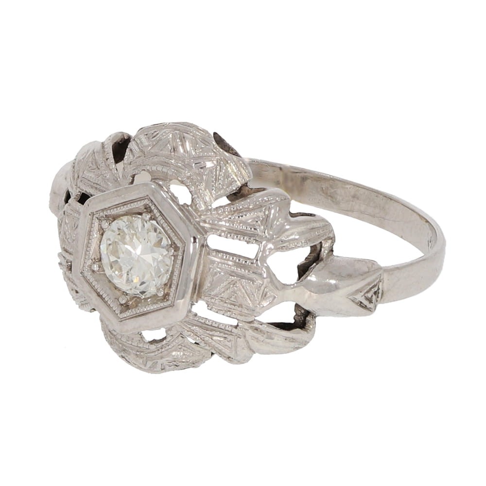 Pięknie zdobiony pierścionek wykonany z białego złota. Pierścionek posiada centralnie osadzony diament z ażurowymi zdobieniami dookoła.