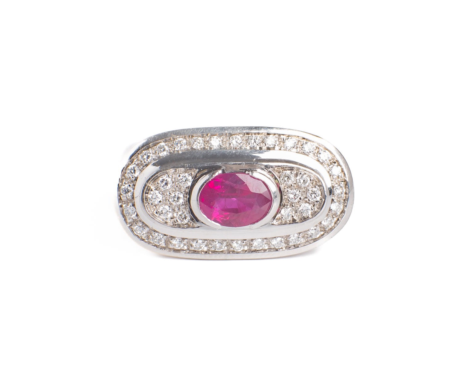 Oryginalny pierścionek w białym złocie. Dość duży i ciężki. Centralnie ulokowany ma rubin o masie 0,65 ct. Okalają go 40 diamenty.