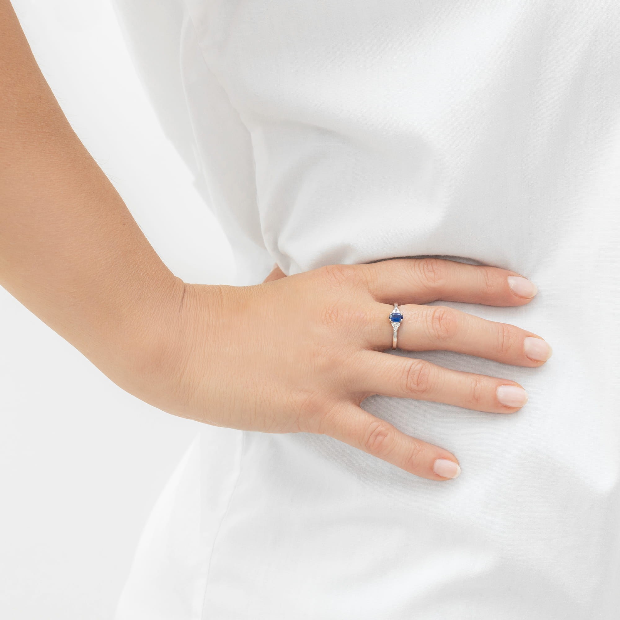 Pierścionek z białego złota z owalnym szafirem o masie ~0,05ct i 6 brylantami. Tradycyjny styl tego pierścionka jest jednym z najpopularniejszych i poszukiwanych przez Klientów.