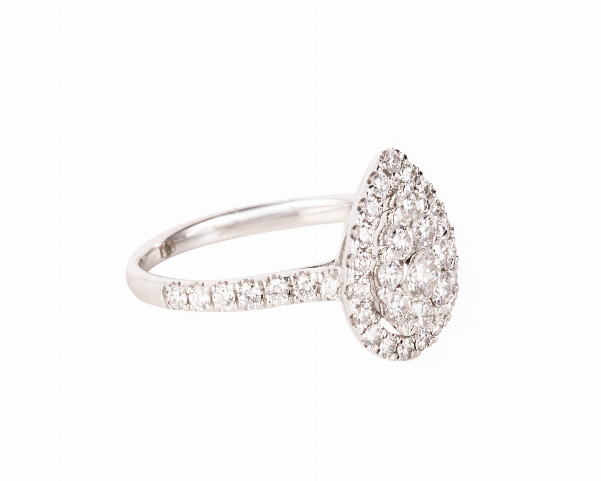 Pierścionek z diamentami, w kształcie łezki, w białym złocie