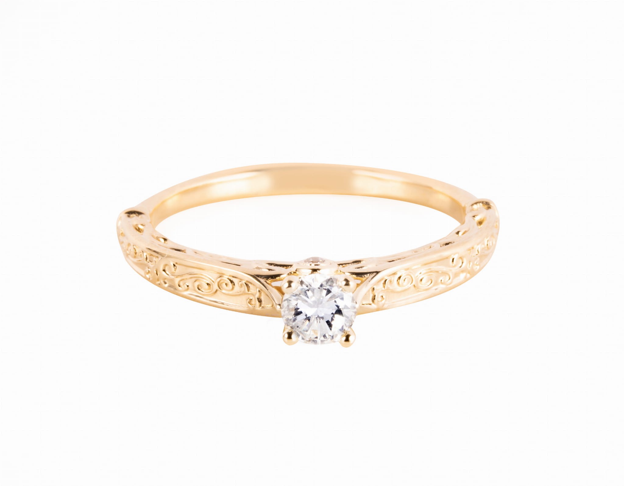 Pierścionek z pięknie zdobioną obrączką, z diamentami. Główny kamień ma masę ok. 0,23 karata, a mniejsze zakute obok jego oprawy ok. 0,02 karata. Całość wykonana w żółtym złocie próby 3, tj. 585.