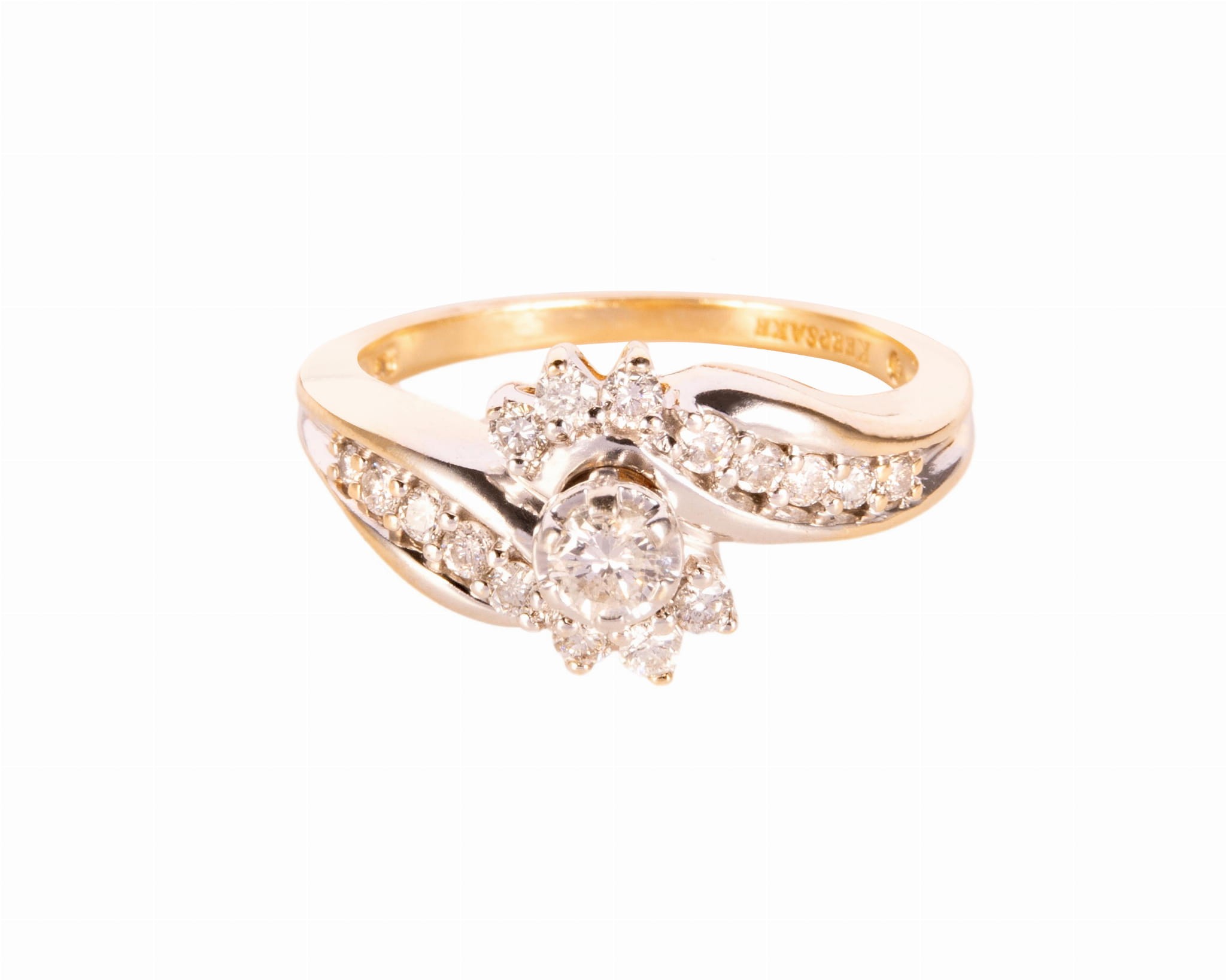 Ciekawy pierścionek z diamentami o łącznej masie ok. 0,50 karata, czystości Si-P oraz barwy G-I. Całość wykonana ze złota próby 3, tj. 585. Pierścionek ma rozmiar 14.
