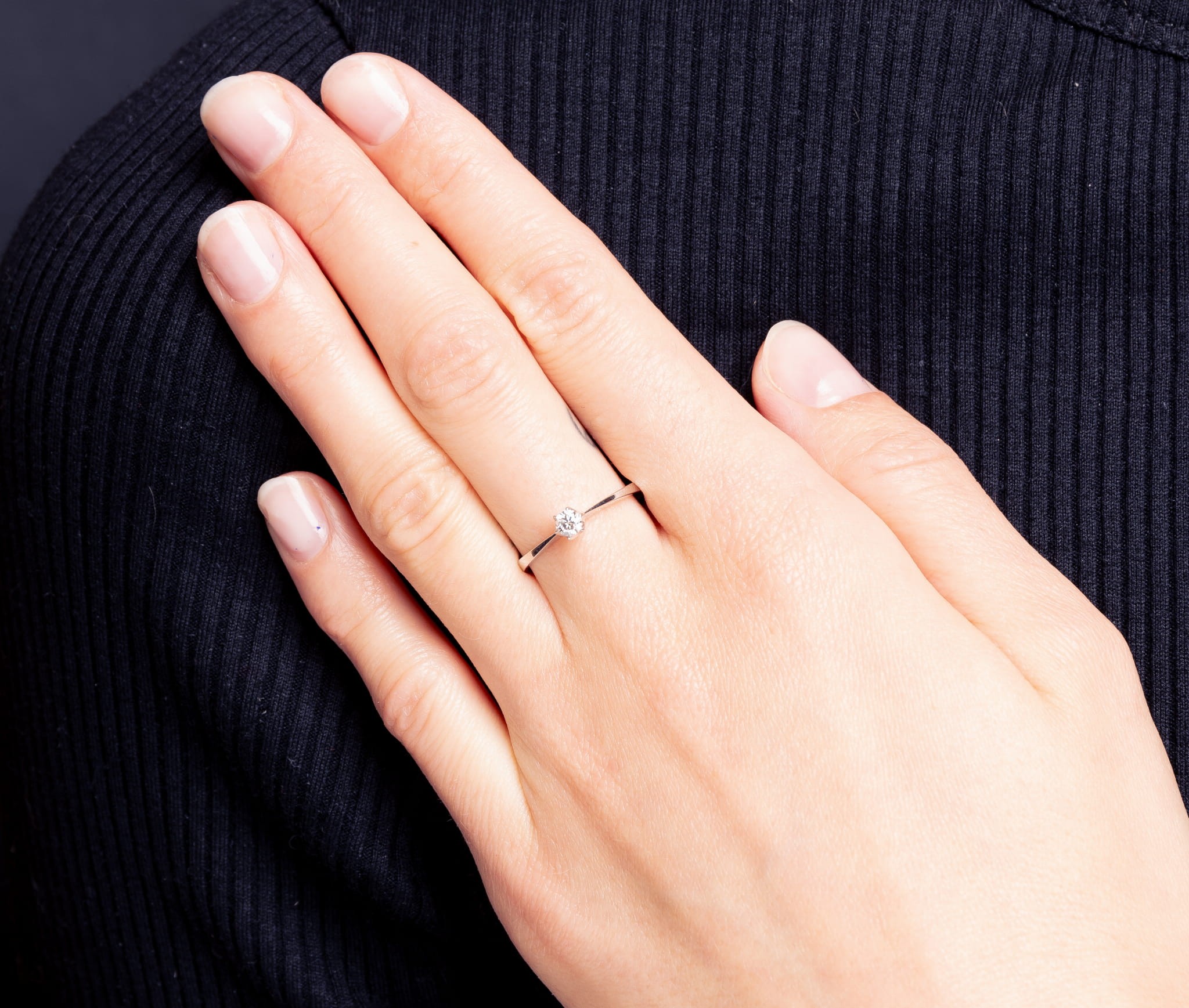 Delikatny pierścionek w białym złocie próby 3, z diamentem wielkości fi 3,25 mm i przybliżonej masie 0,12 karata.