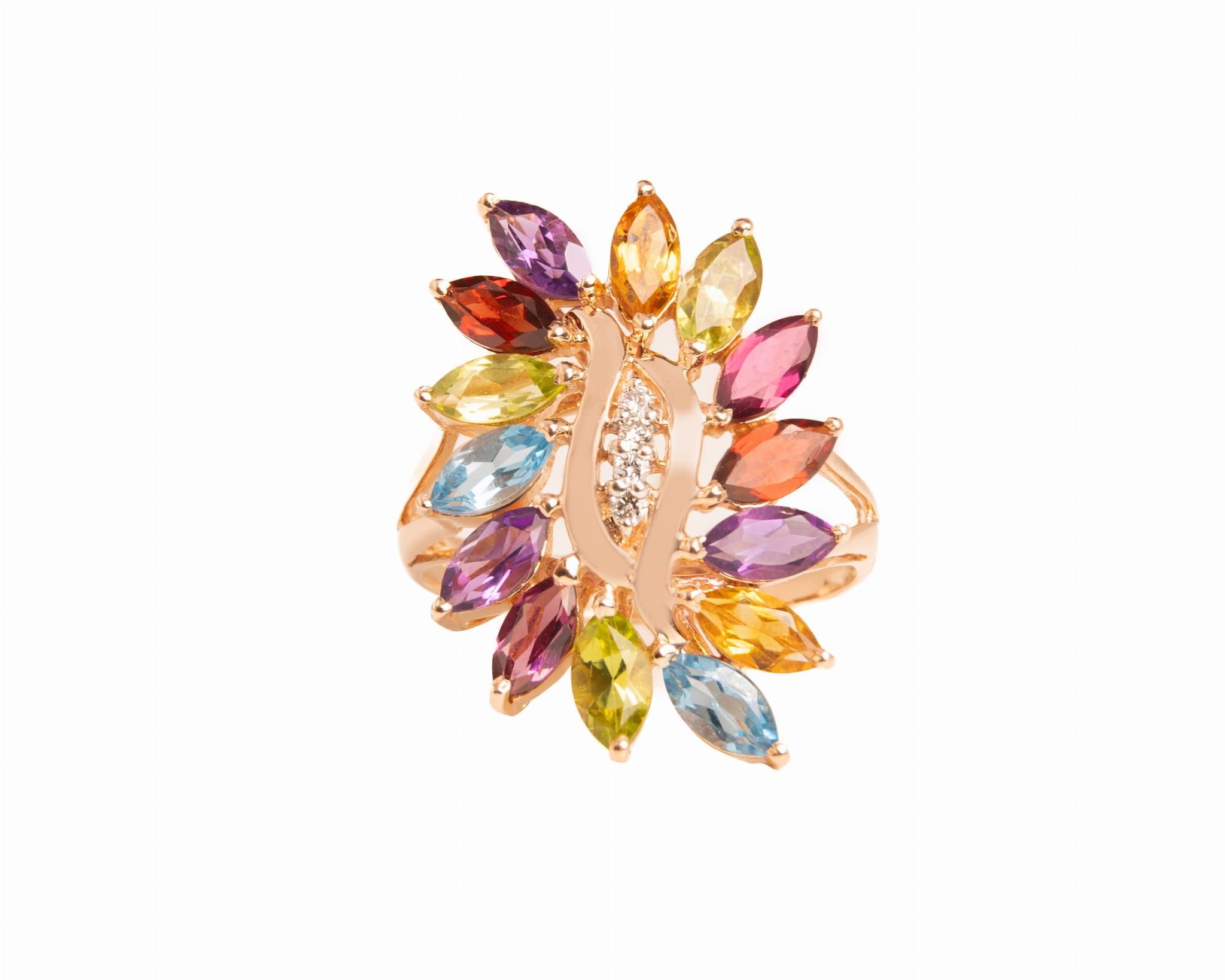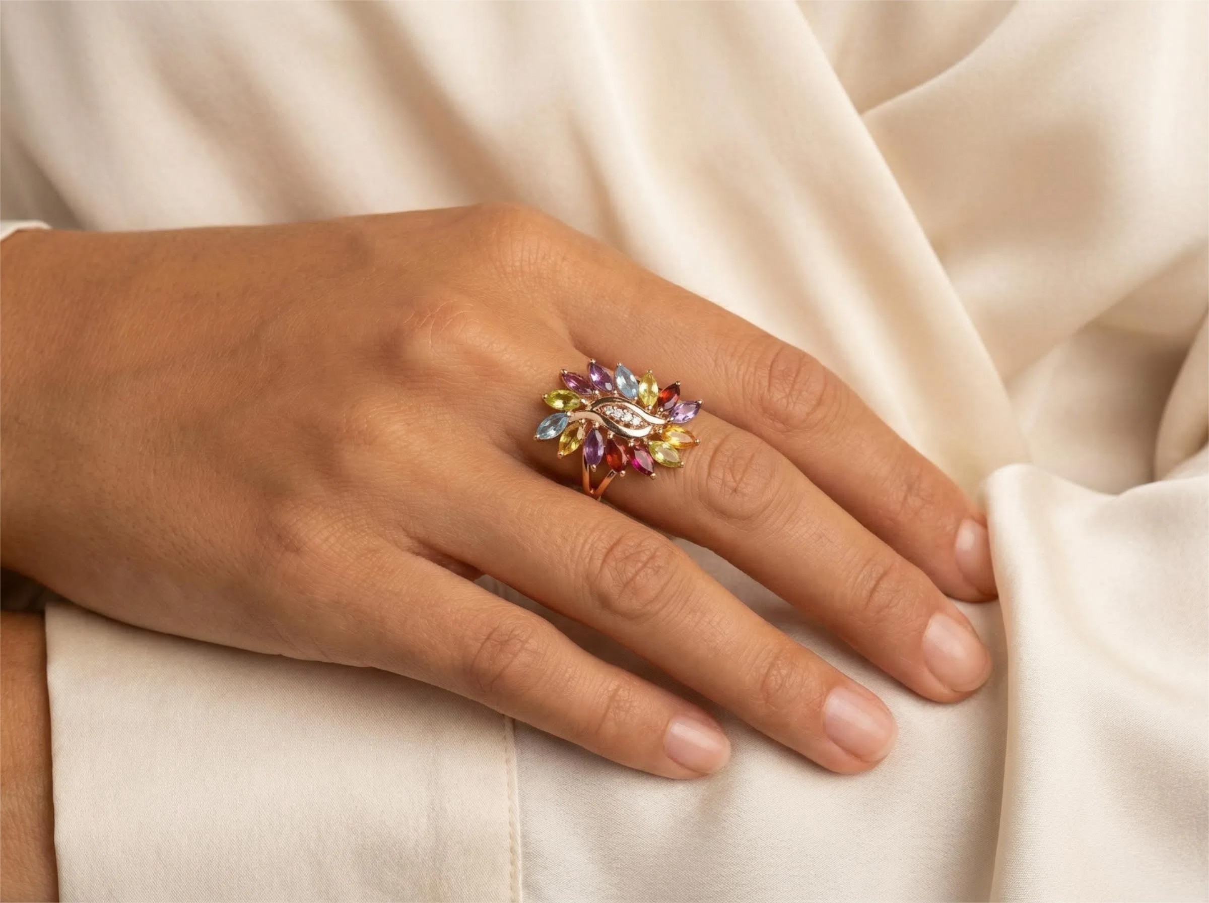 Pierścionek ma wyraźnie kwiatowy kształt – kolorowe kamienie w szlifie markiza (wydłużonym, migdałowym) ułożone są wokół centralnej osi, tworząc formę przypominającą kwitnący kwiat widziany z góry. Każdy kamień to jeden płatek, a diamenty tworzą błyszczący środek kwiatu.