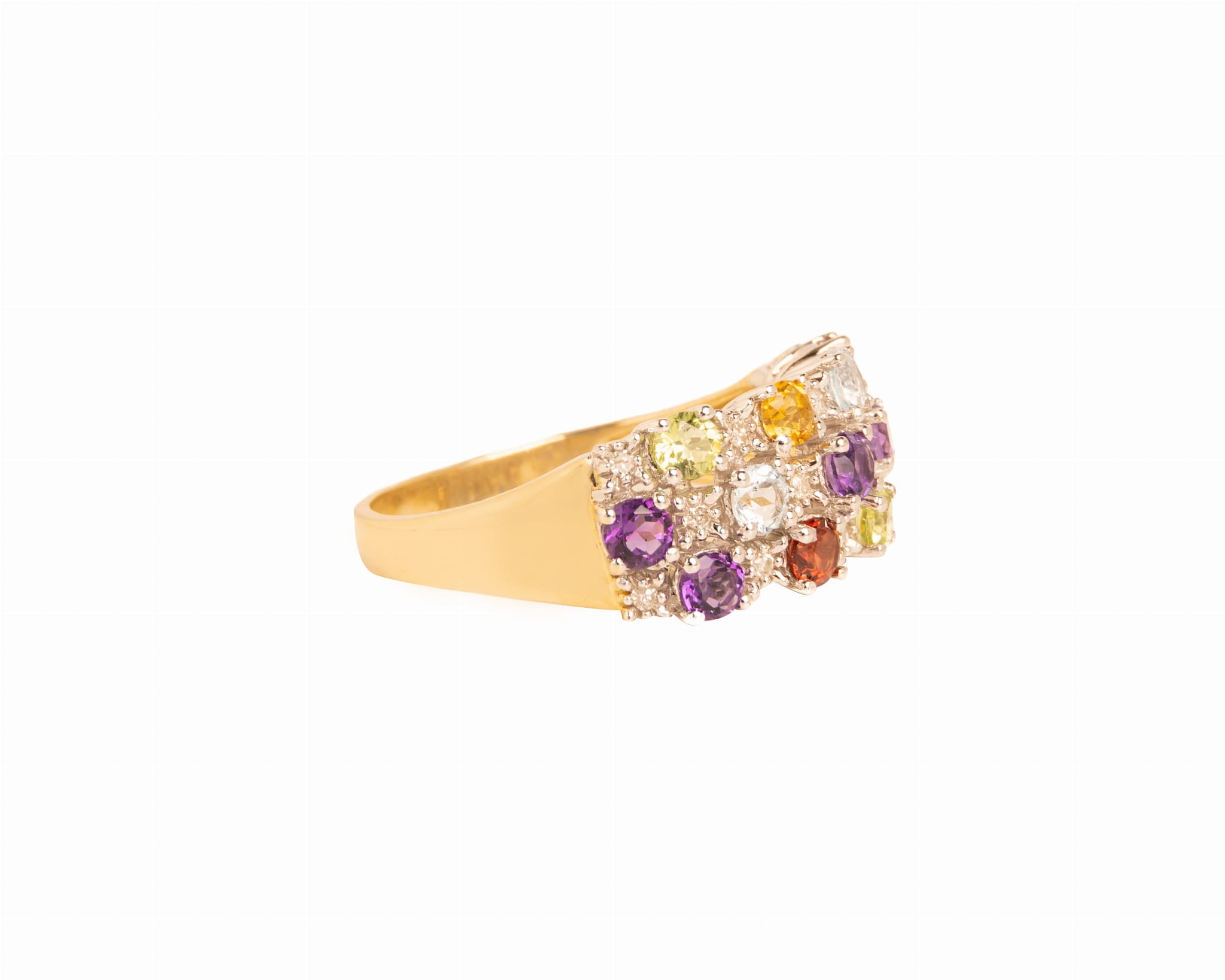 Pierścionek wykonany w złocie próby 375. wysadzany 13 kolorowymi kamieniami szlachetnymi i diamentami.