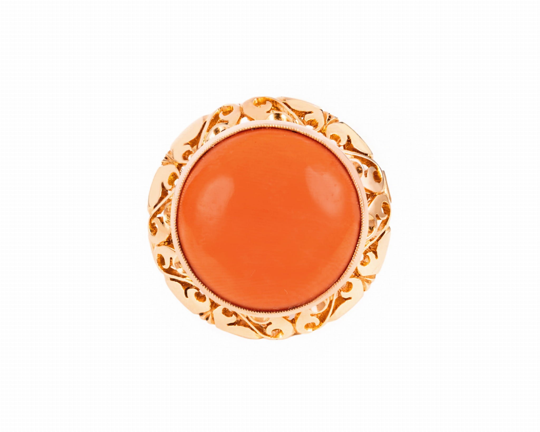 Pierścionek wykonany w żółtym złocie próby 3, tj. 585, na rozmiar 16,5. Z centralnie zakutym koralem.