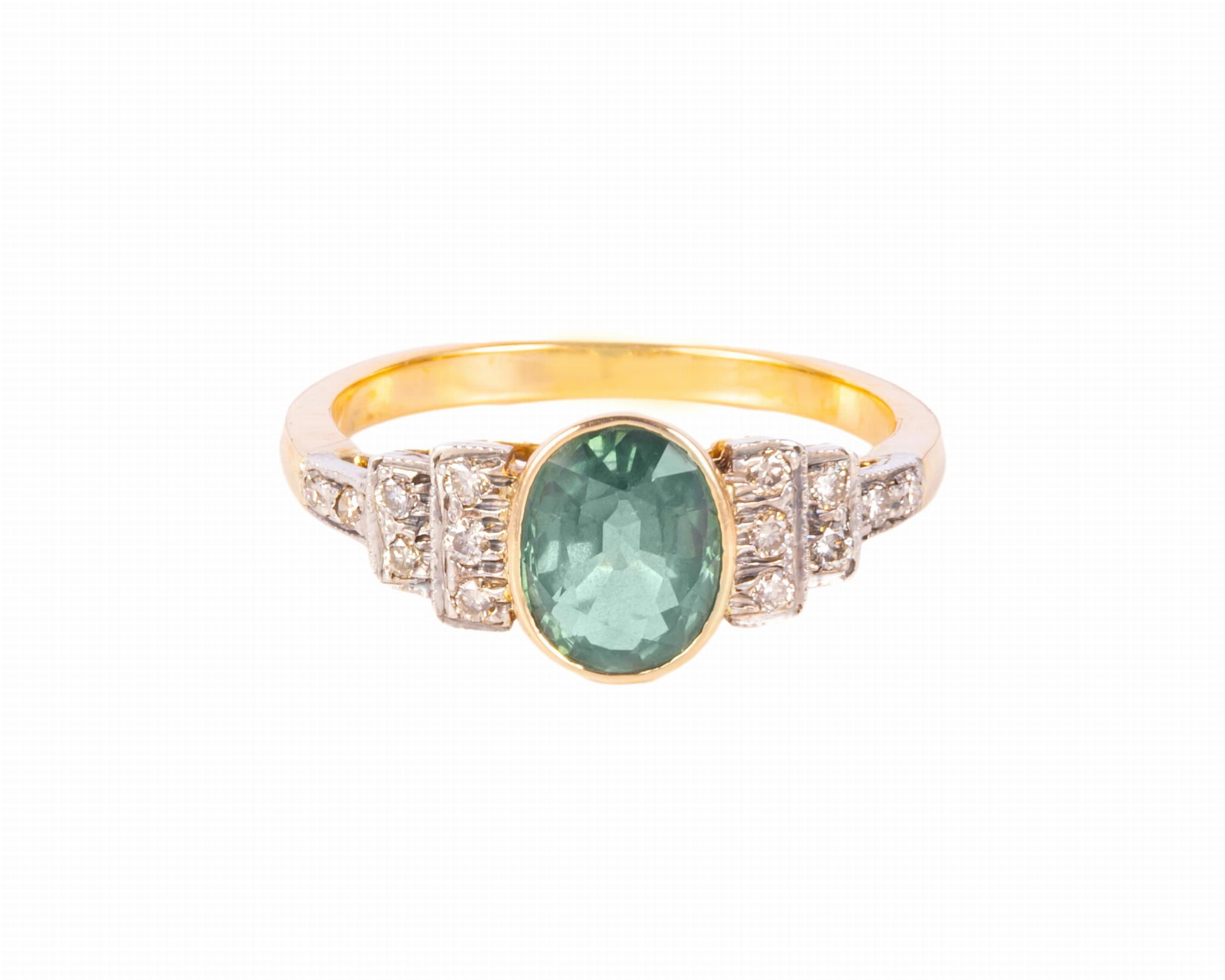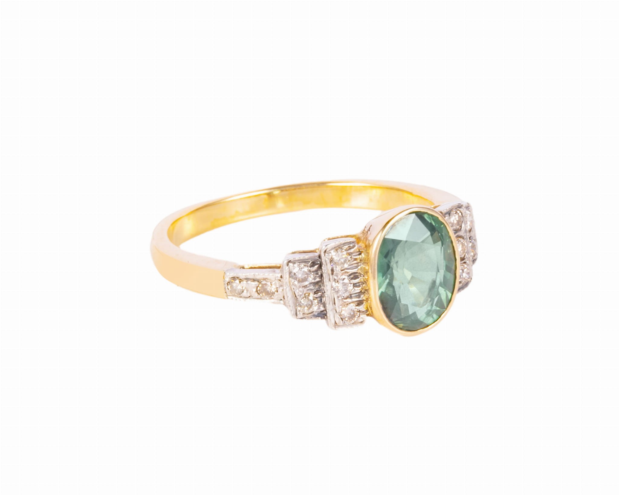 Złoty pierścionek z centralnie osadzonym korundem syntetycznym z efektem aleksandrytu (efekt delikatnej zmiany koloru w różnym typie oświetlenia). Po bokach osadzono łącznie 14 diamentów masy ok. 0,15 karata. Całość wykonana w złocie próby 750 oraz elementami w srebrze. Pierścionek ma rozmiar 14.