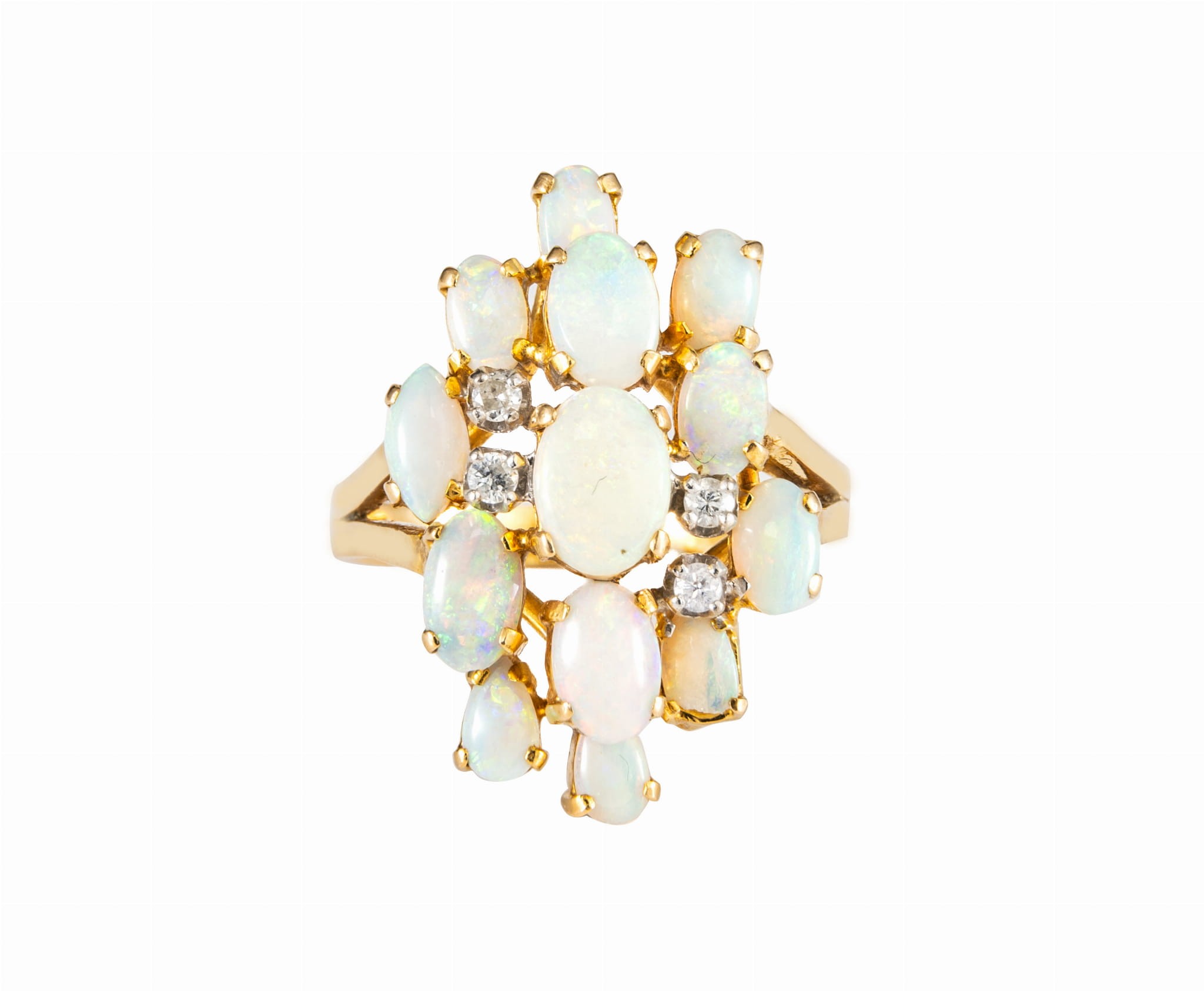 Niezwykły pierścionek z wieloma kamieniami, mamy tutaj: 13 kamieni australijskich i 4 diamenty, wszystkie zakute w łapki. Całość wykonana w żółtym złocie 14 karatowym. Pierścionek idealnie sprawdzi się dla miłośniczki biżuterii z opalami.