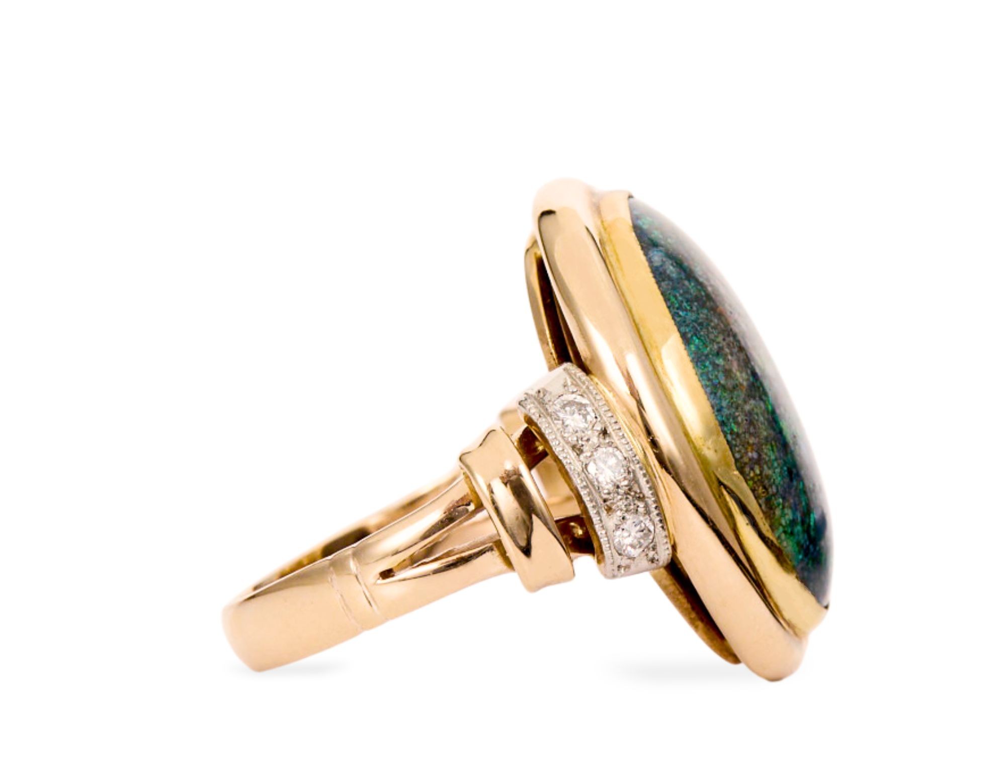 Pierścionek zbudowany jest wokół dużego, owalnego opalu w szlifie kaboszonowym – gładkiego, wypukłego kamienia bez faset, eksponującego naturalną powierzchnię i głębię minerału. Opal osadzony jest w oprawie carga z żółtego złota – szeroka, polerowana złota rama otacza kamień dookoła i unosi go wyraźnie ponad obrączkę. Po obu stronach oprawy, w miejscu gdzie górka łączy się z ramionami, osadzone są po trzy brylanty w oprawach z platyny – małe, srebrzyste, zdobione milgrainem, co nadaje im szlachetnego charakteru. Ramiona obrączki mają różowawy odcień złota – subtelnie inny niż żółta oprawa opalu, co tworzy delikatną, wielotonową kompozycję metalu. Widok z boku ujawnia znaczną wysokość i objętość górki – to pierścionek z prawdziwą, trójwymiarową obecnością.
