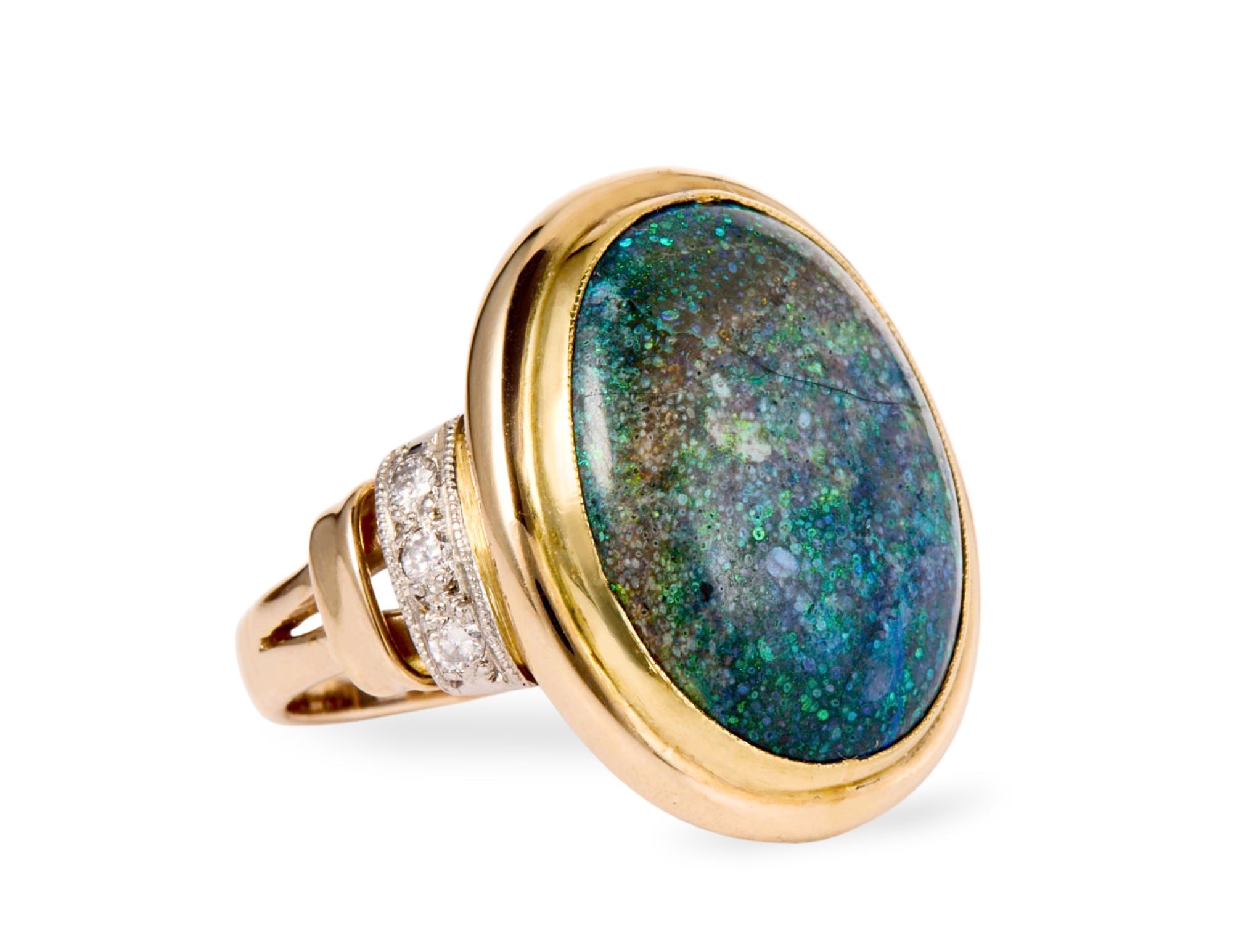 Szlif kaboszonowy – gładka kopuła bez faset – jest tradycyjnym i jedynym właściwym sposobem obróbki opali: fasety zniszczyłyby efekt opalescencji, podczas gdy gładka powierzchnia pozwala mu się w pełni rozwinąć i zmieniać wraz z kątem padania światła. Wymiary opalu ok. 20 x 15,5 x 5 mm to kamień o znacznej wielkości i wyraźnej wypukłości – dominuje wizualnie nad całym pierścionkiem. Opal jest kamieniem miesiąca października i od wieków symbolizuje kreatywność, wyobraźnię i zmienność.