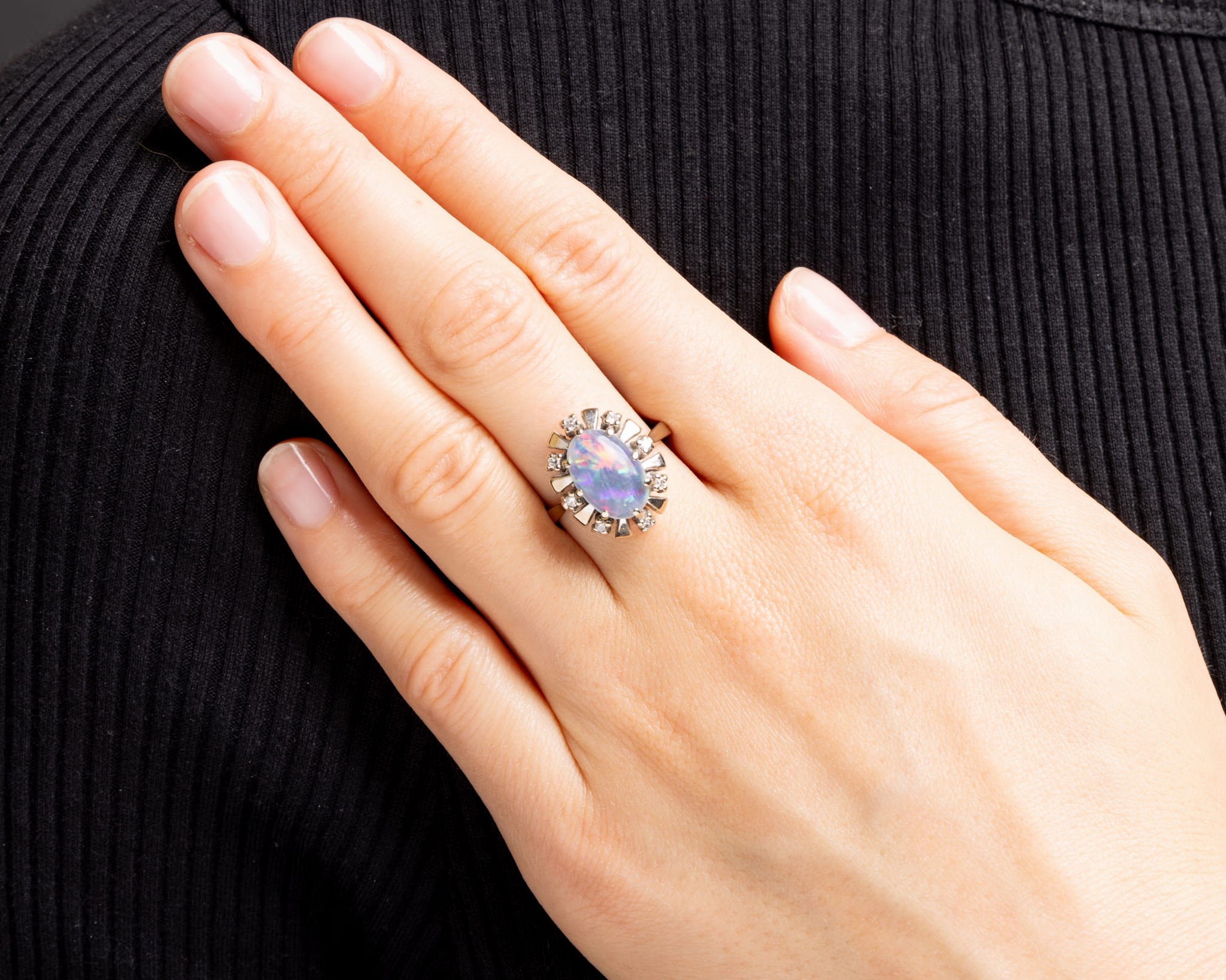 Złoty pierścionek z opalem (dublet) otoczonym 8 diamentami o przybliżonej masie 0,12 karata, o czystości Si i barwie H.