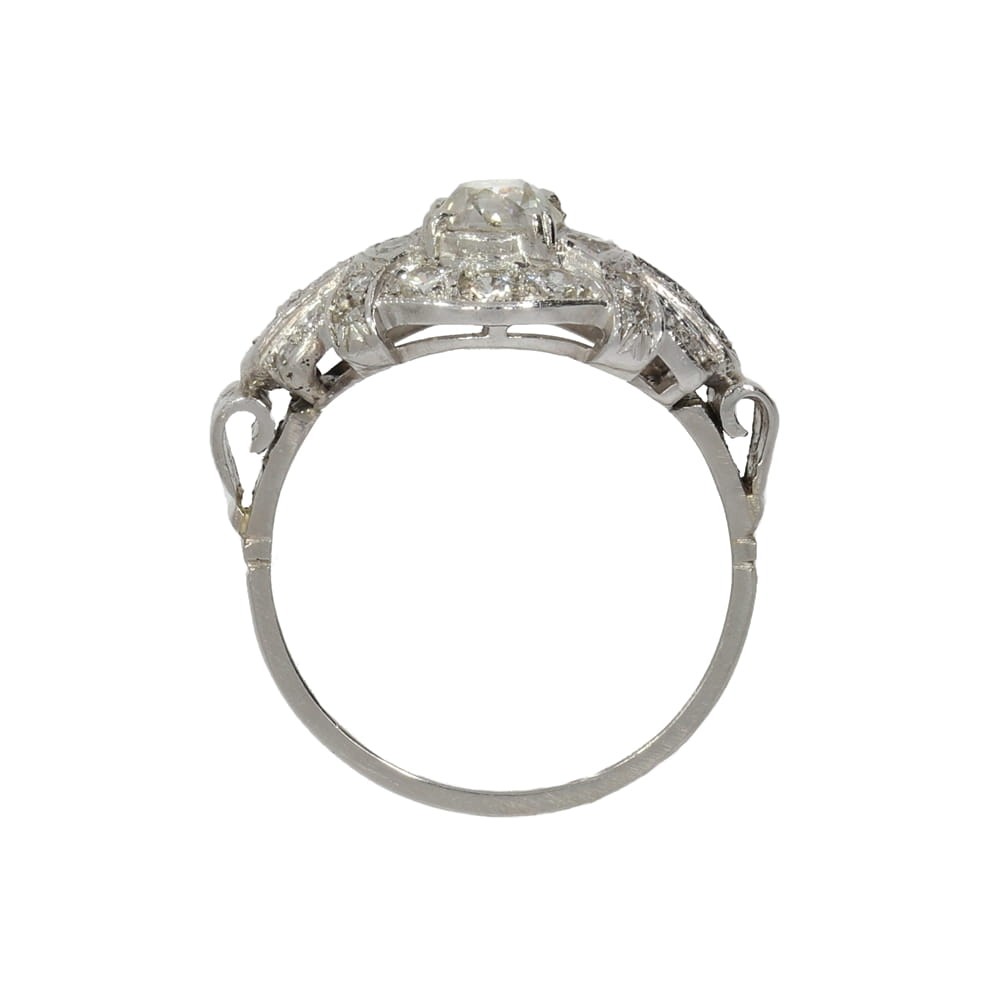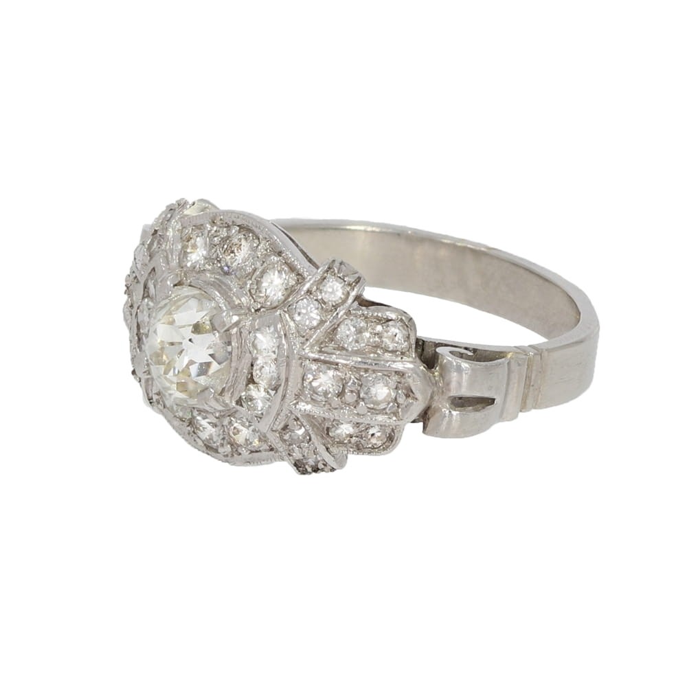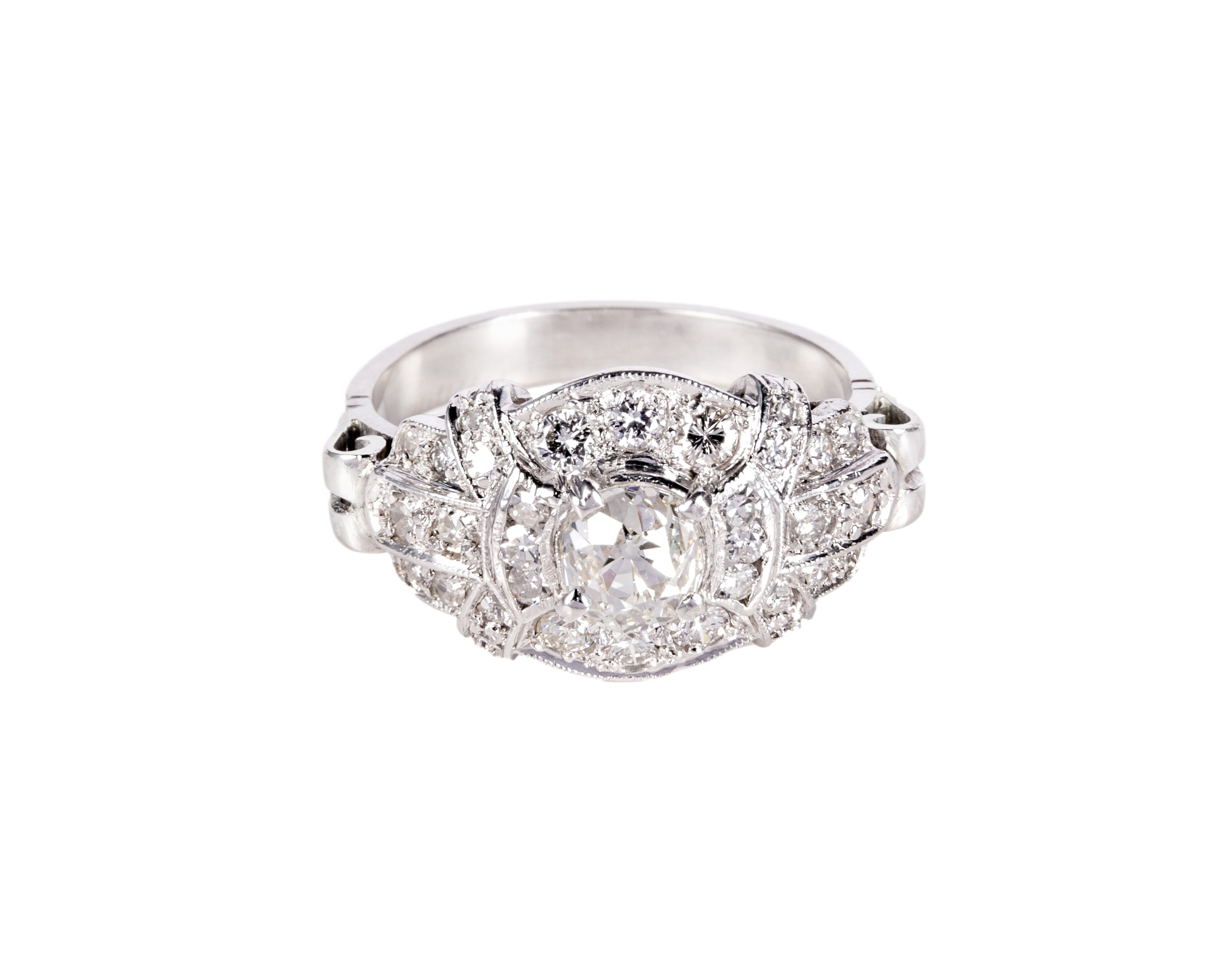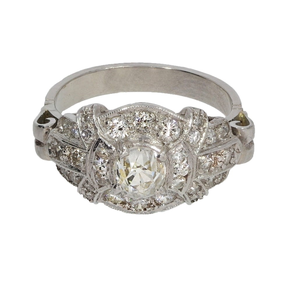 Czarujący pierścionek z platyny, złota i srebra z 33 diamentami w starym i mieszanym szlifie. Bardzo ładnie prezentuje się na dłoni. Idealny na prezent dla bliskiej osoby.