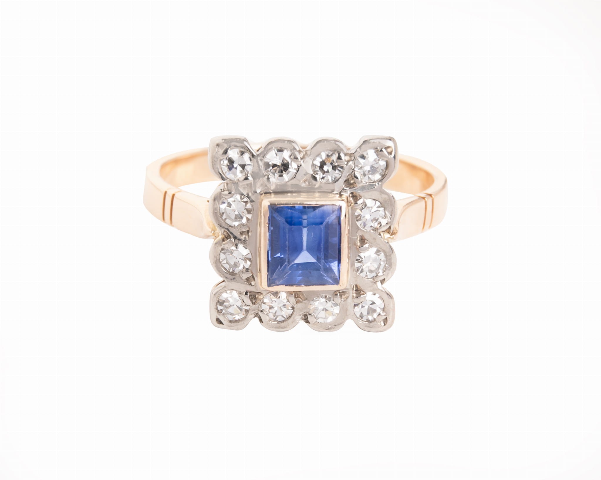 Pierścionek z szafirem w szlifie tablicowym o masie ok. 0,65 karata i 12 diamentami oprawionymi dookoła szafiru. Diamenty są w szlifie ósemkowym i mają łączną masę ok. 0,30 karata, czystość VS oraz barwę G - H. Całość wykonana w żółtym złocie próby trzeciej.