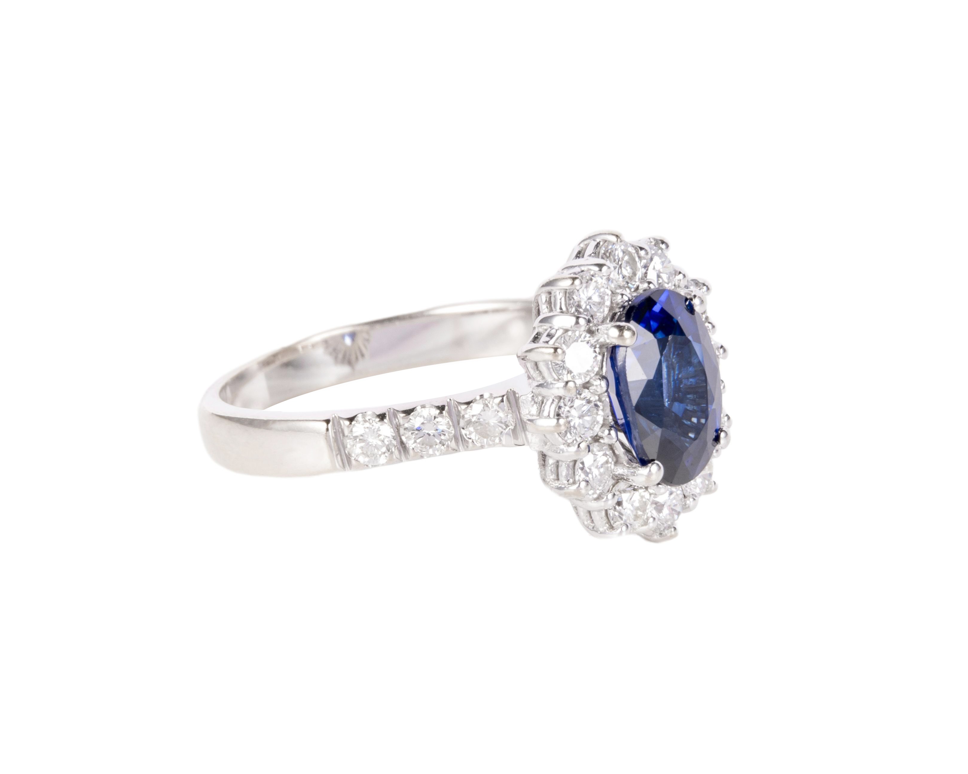 Pierścionek wykonany z białego złota próby 750, z centralnie osadzonym szafirem i diamentami zakutymi dookoła centralnego kamienia i w obrączce. Pierścionek ma rozmiar 11.
