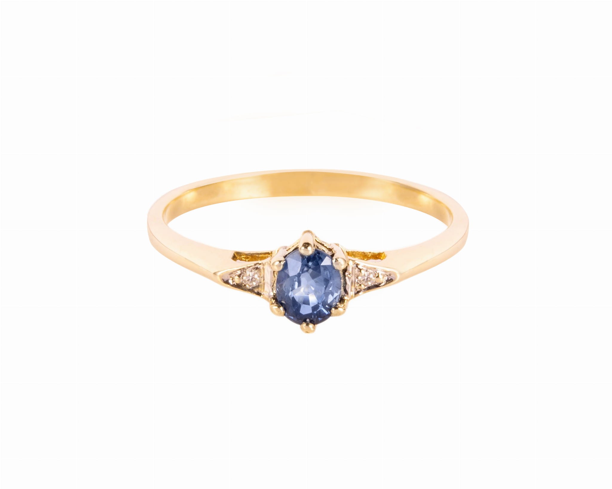 Złoty pierścionek z centralnie zakutym w łapki szafirem o masie ok. 0,40 karata o wymiarach 4,57-3,64/2,47 mm oraz bocznymi diamentami w szlifach ósemkowych o łącznej masie ok. 0,02 karata, czystości Si oraz barwie H. Pierścionek wykonany w żółtym złocie próby 583, na rozmiar 15.