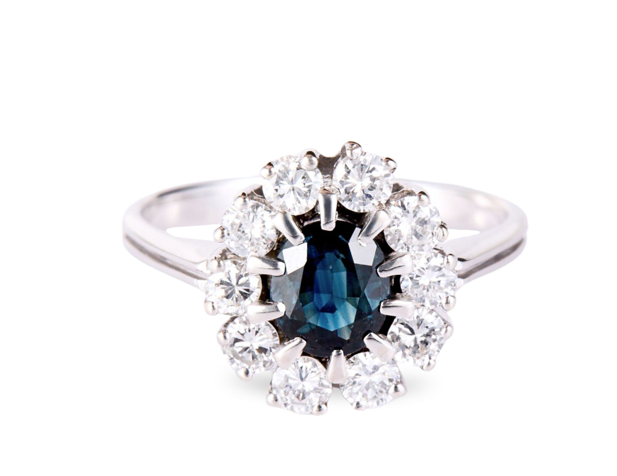 Pierścionek z szafirem otoczony brylantami, białe złoto
