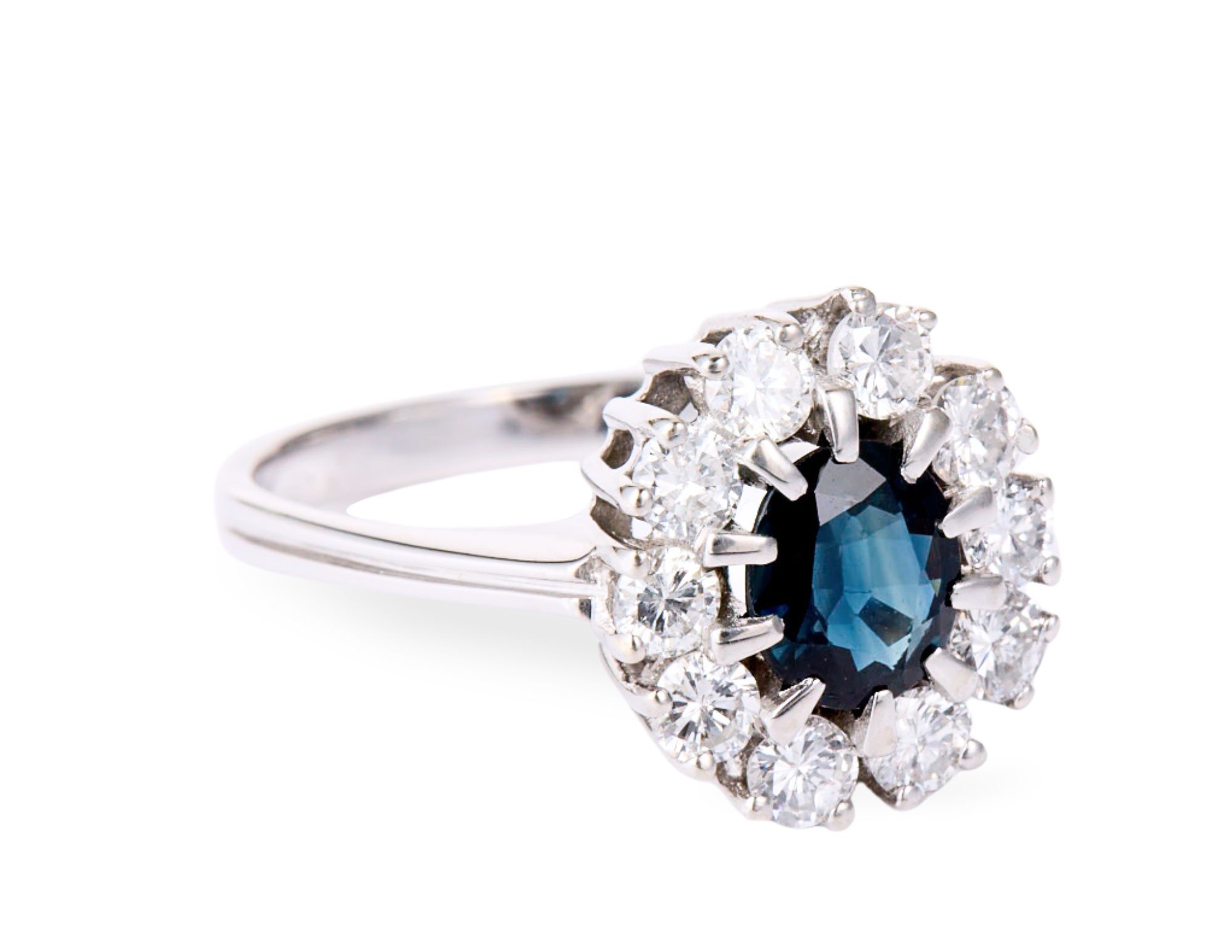 Pierścionek wykonany jest z białego złota próby 585 (14 karatów). Chłodny, srebrny odcień metalu harmonizuje z bezbarwnością brylantów i nie zaburza głębokiej barwy szafiru – białe złoto jest dla tego zestawienia idealnym tłem. Waga 3,48 g przy tak rozbudowanej górce z dziesięcioma brylantami i dużym szafirem świadczy o precyzji i lekkości wykonania.