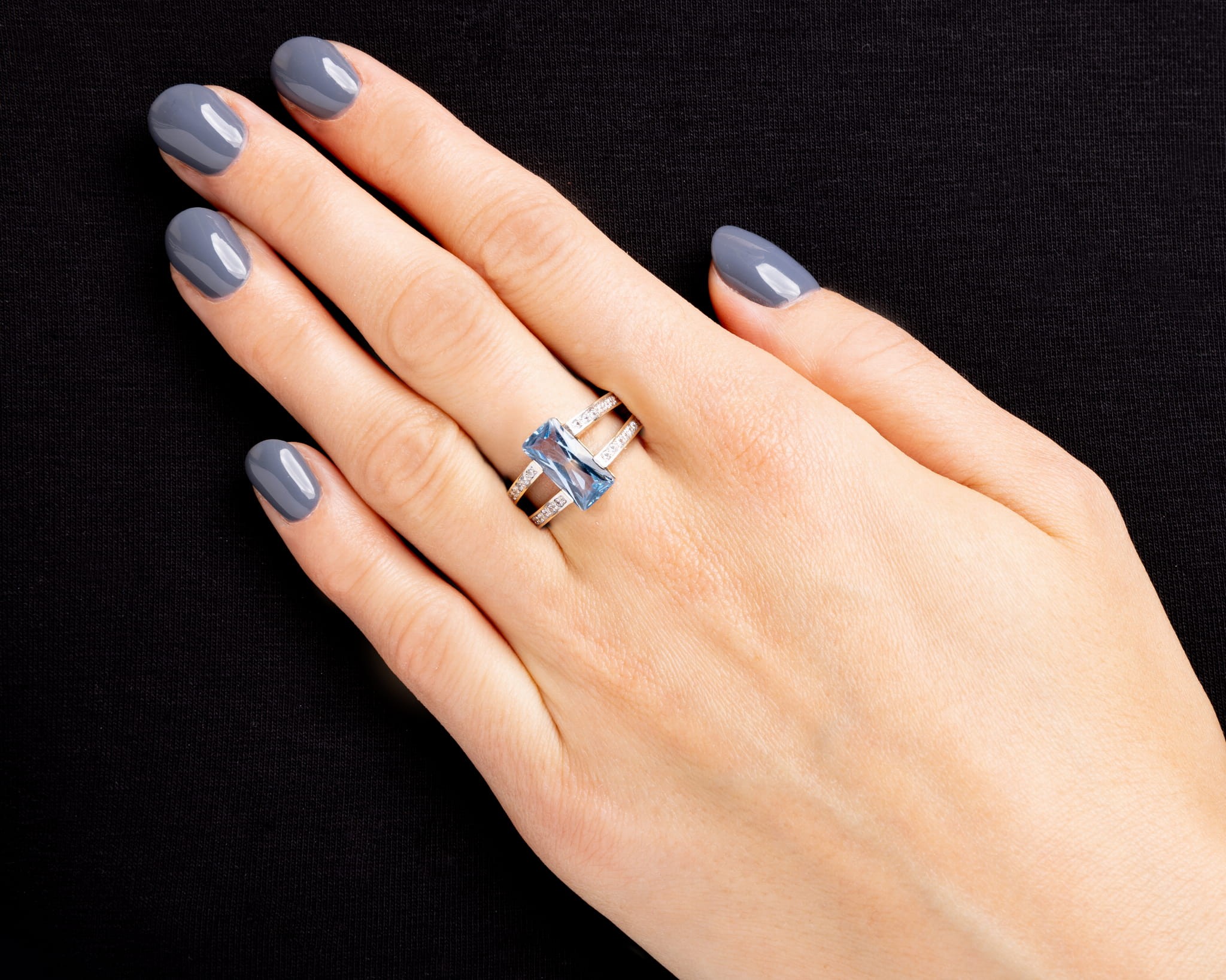 Pierścionek z okazałym, jasno niebieskim topazem i białymi cyrkoniami zakutymi w obrączce pierścionka. Całość wykonana w żółtymi złocie 3 próby, na rozmiar 14,5.