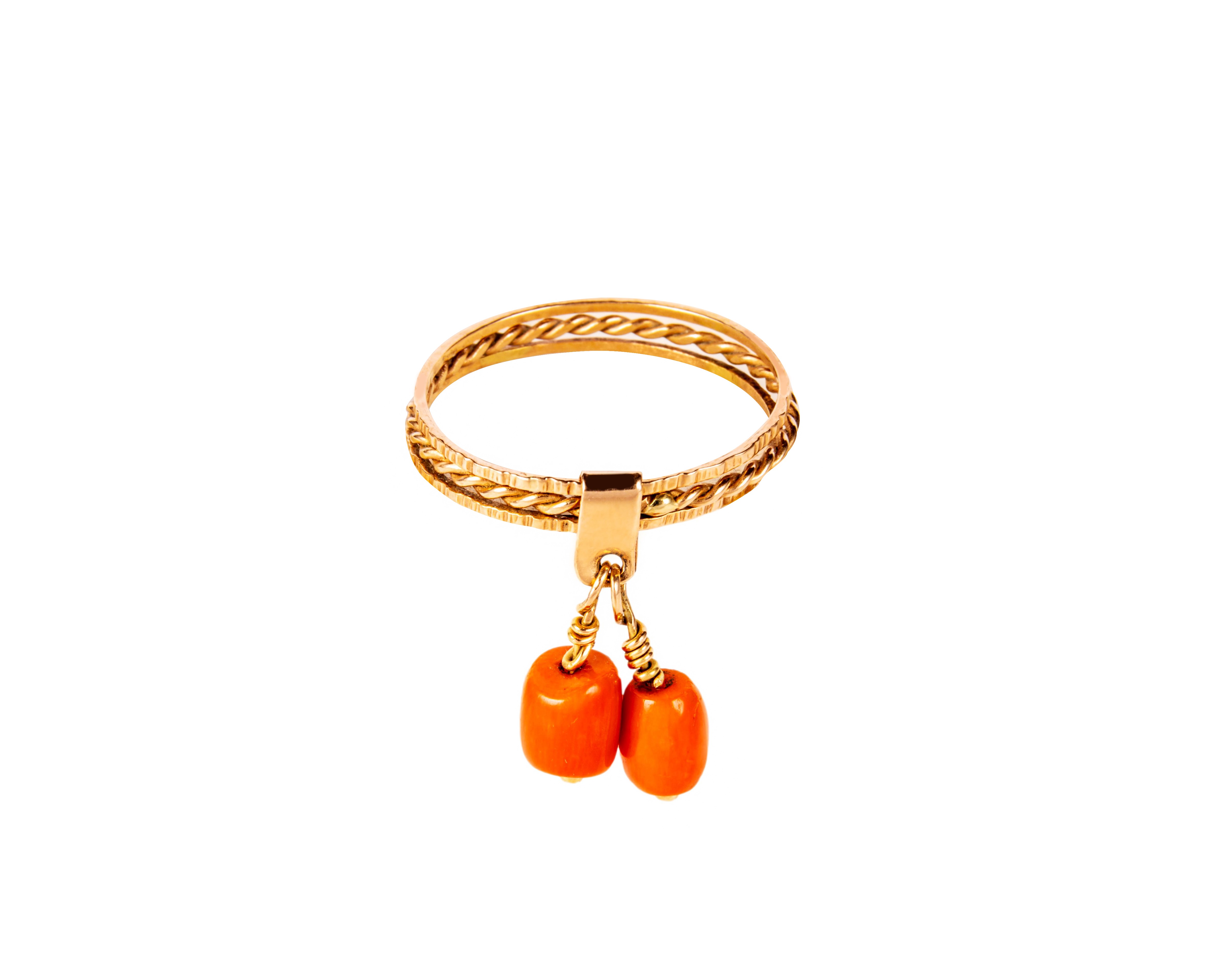Złoty pierścionek z potrójna obrączką spiętą poprzeczną blaszką na której umieszczono dwie zawieszki z koralem. Powierzchnie obrączek opracowano w dekoracyjny sposób. Pierścionek ma rozmiar 21,5. Całość wykonana w żółtym złocie próby ok. 600.