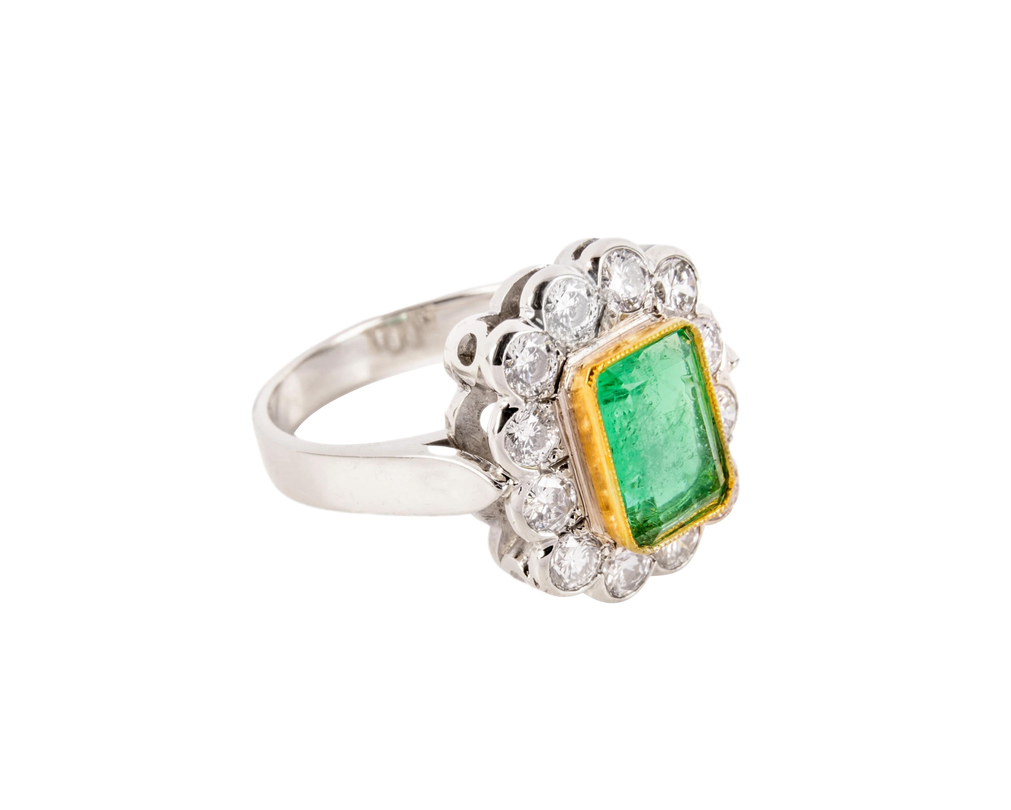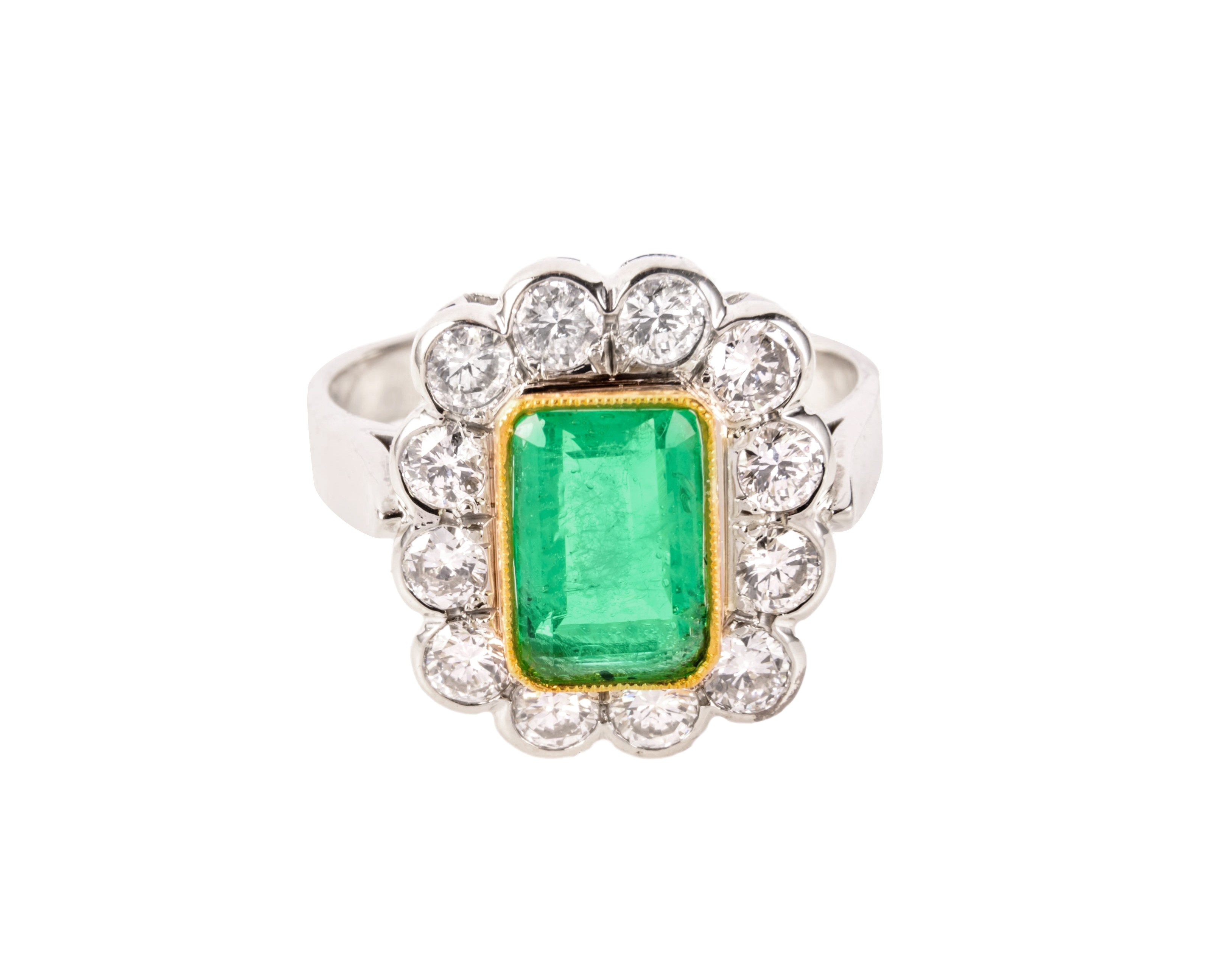 Klasyczny pierścionek wykonany w białym złocie w próbie 3, tj. 585, na rozmiar 16,5. Centralny kamień wykonany z syntetycznego szkła (imitujący szmaragd) otoczony przez 12 diamentów masy łącznej ok. 0,90 karata, czystości VS oraz barwy G-H. Pierścionek ma rozmiar 16,5.
