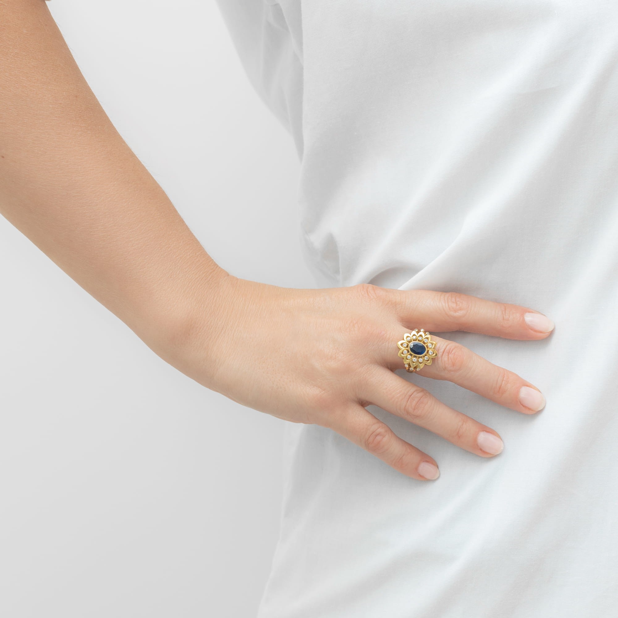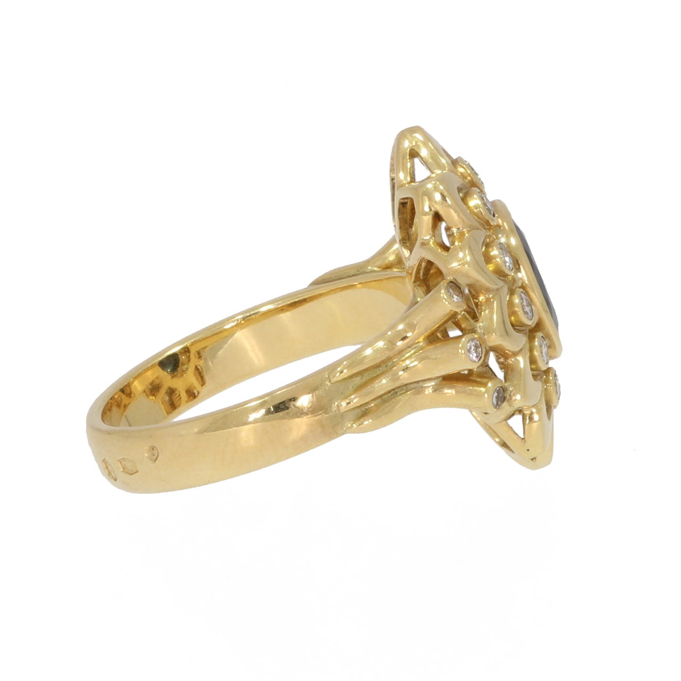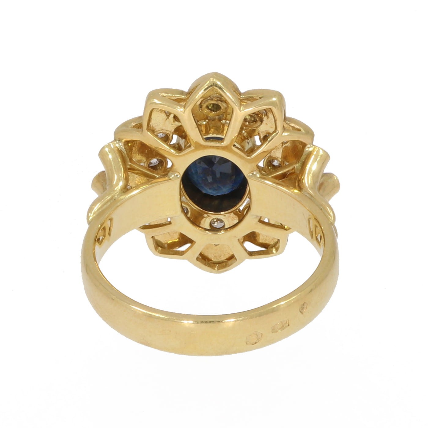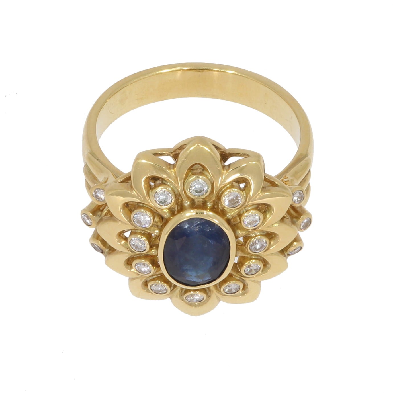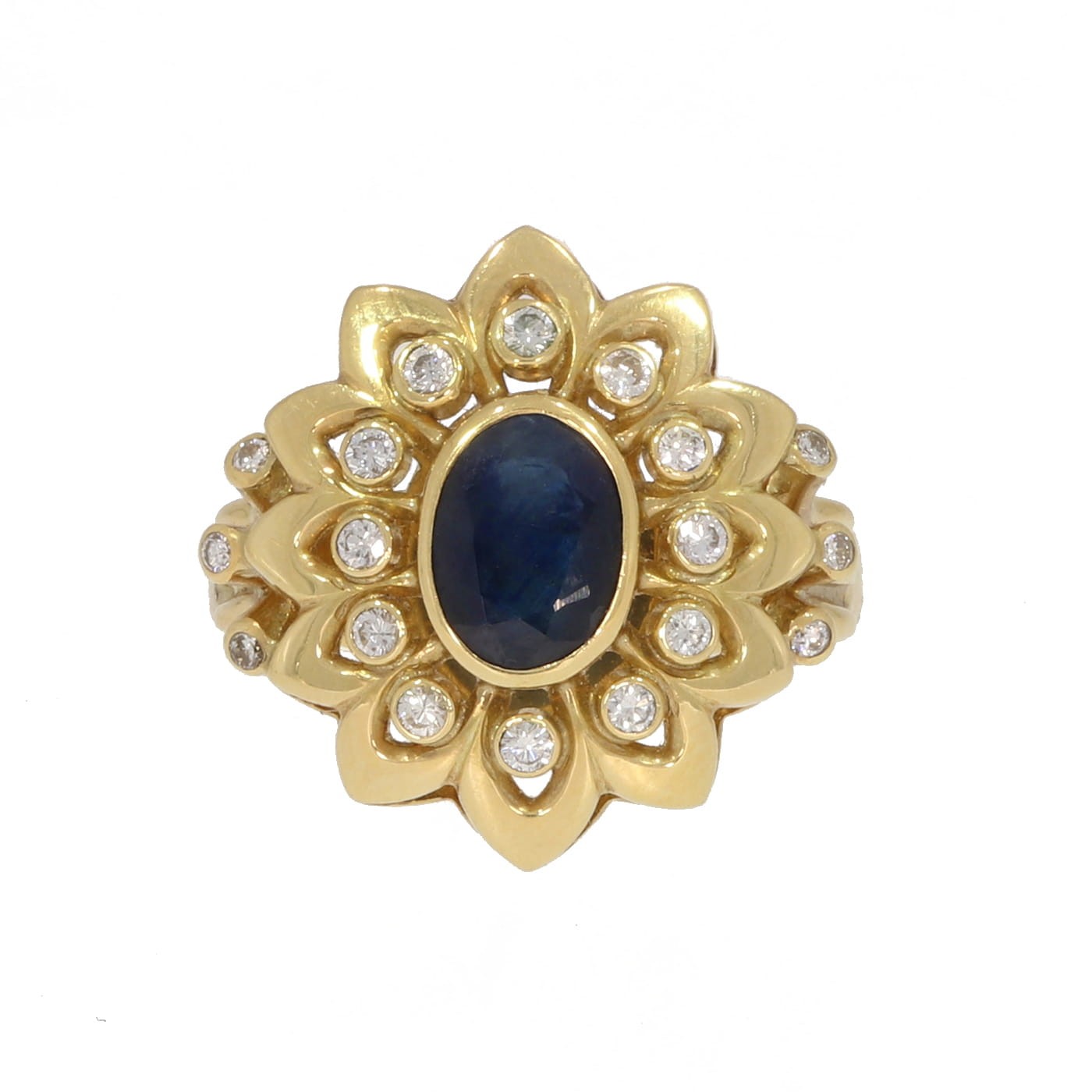 Pierścionek z żółtego złota z owalnym fasetowanym szafirem z 18 diamentami w szlifach brylantowych w oprawie w formie kwiatu.