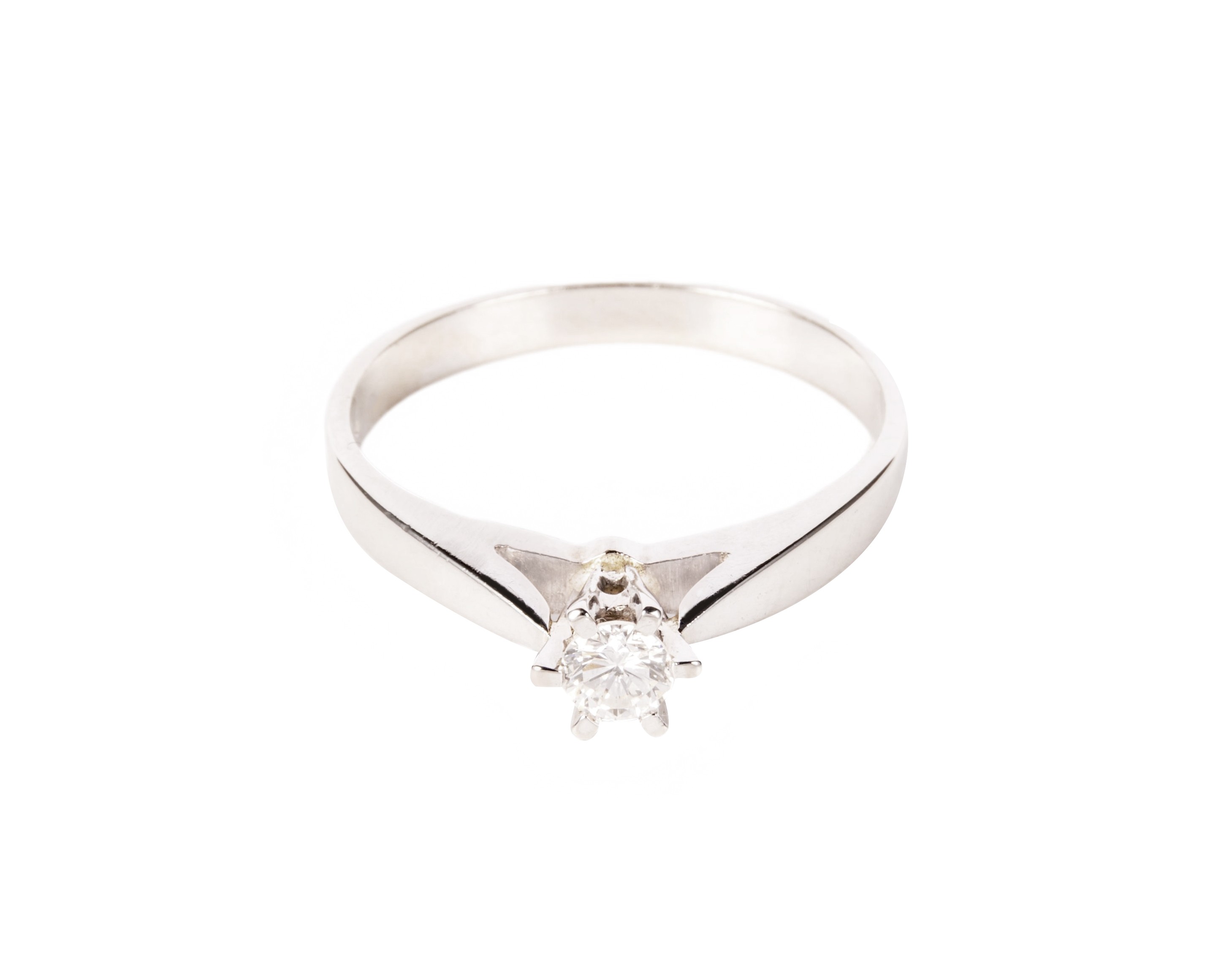 Klasyczny pierścionek zaręczynowy z diamentem zakutym w 6 łapek, o masie ok. 0,15 karata. Czystość diamentu to VS, a barwa H. Pierścionek wykonany w białym złocie próby 585, na rozmiar 18.