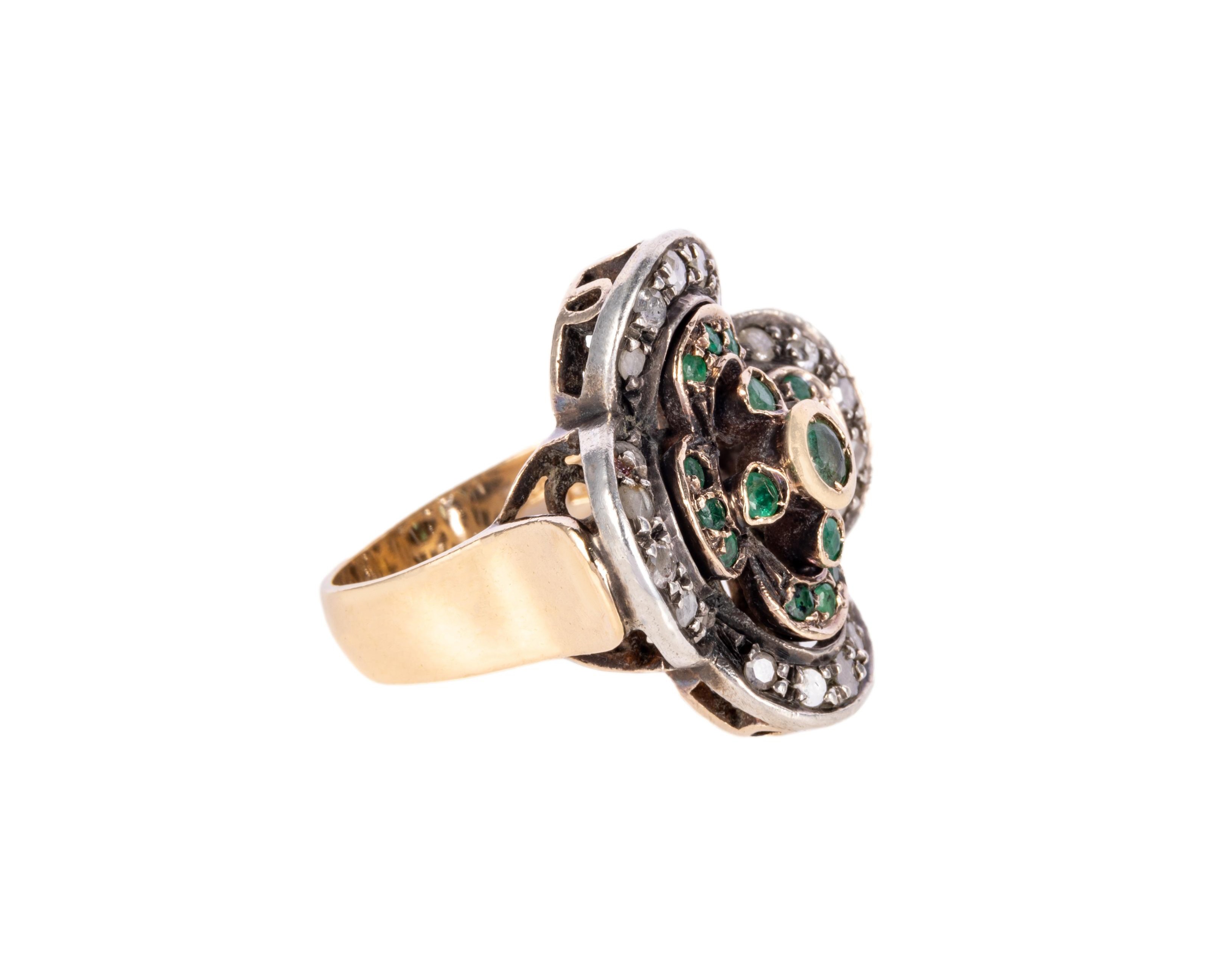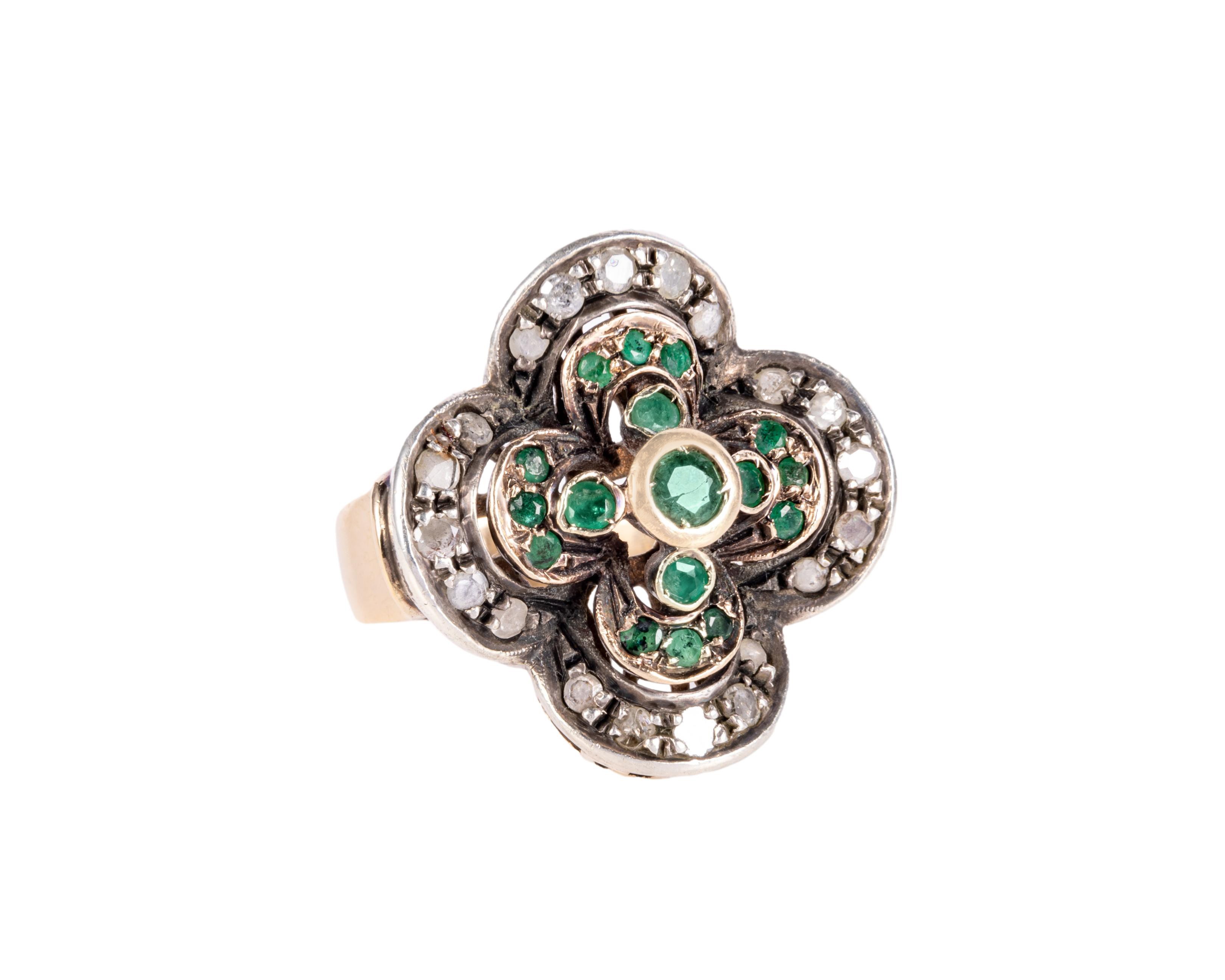 Pierścionek o górce w kształcie czterolistnego kwiatu, wysadzanym szmaragdami i rautami diamentowymi. Pierścionek wykonany z połączenia złota i srebra na rozmiar 16,5.