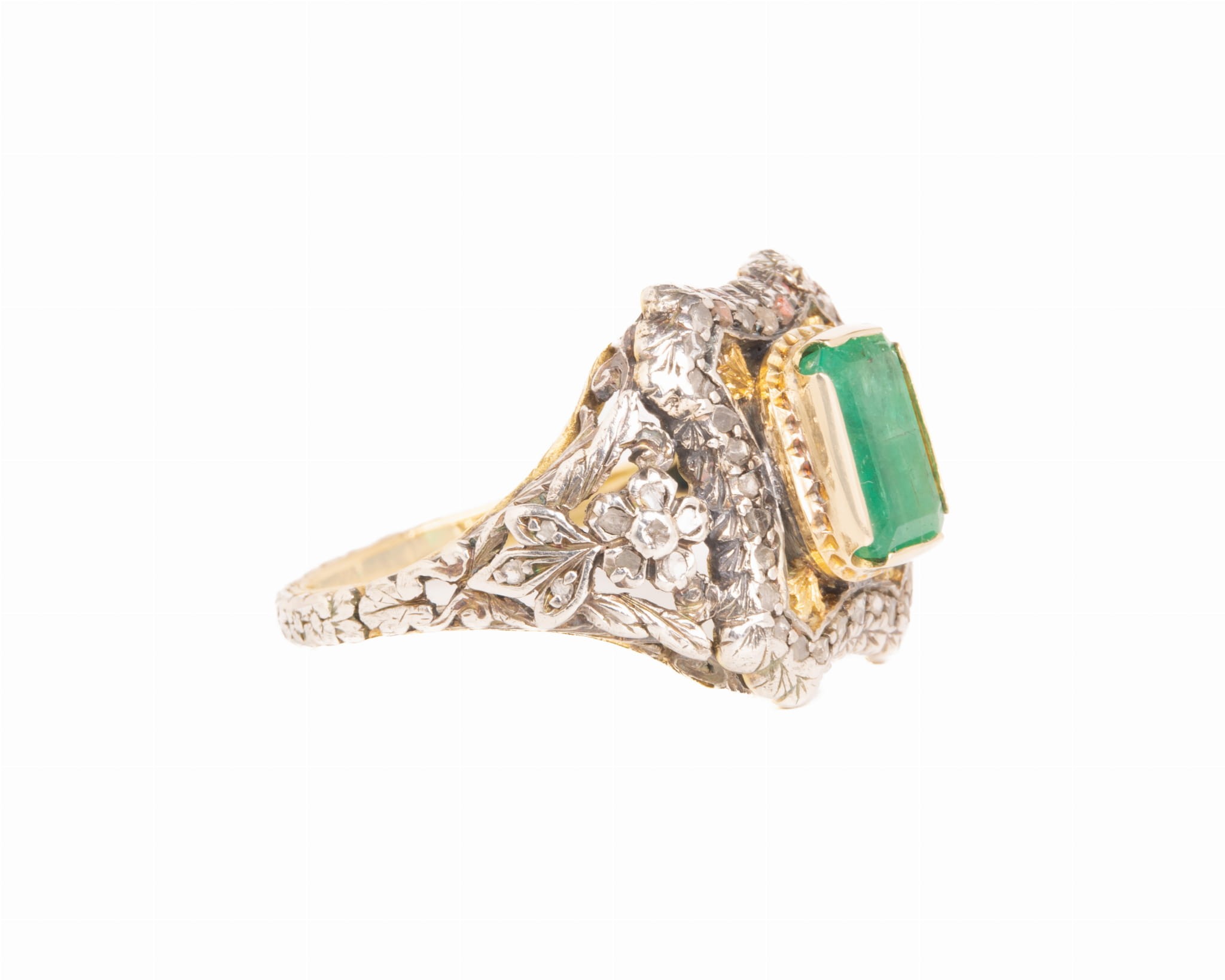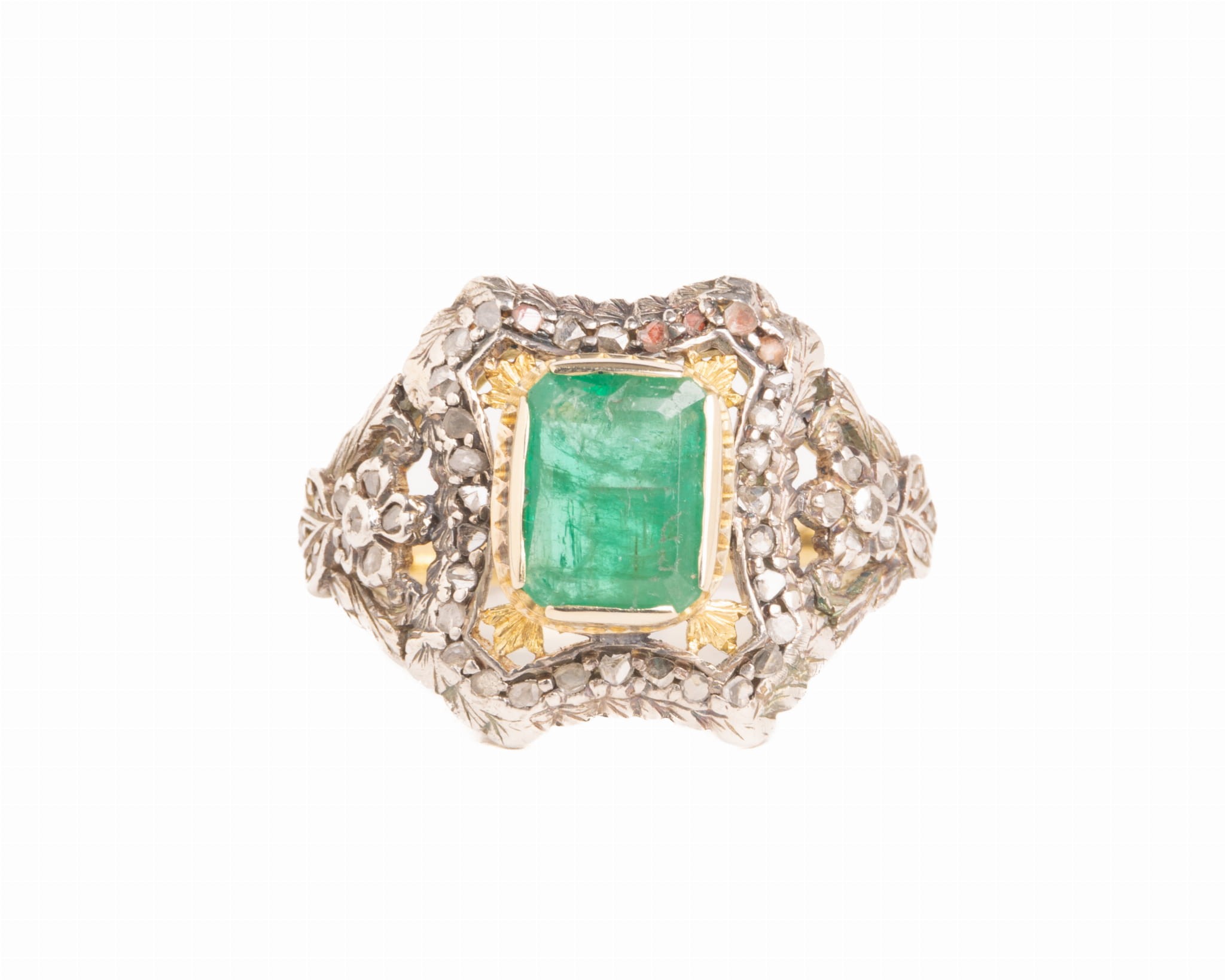 Pierścionek ze szmaragdem i diamentowymi rozetami