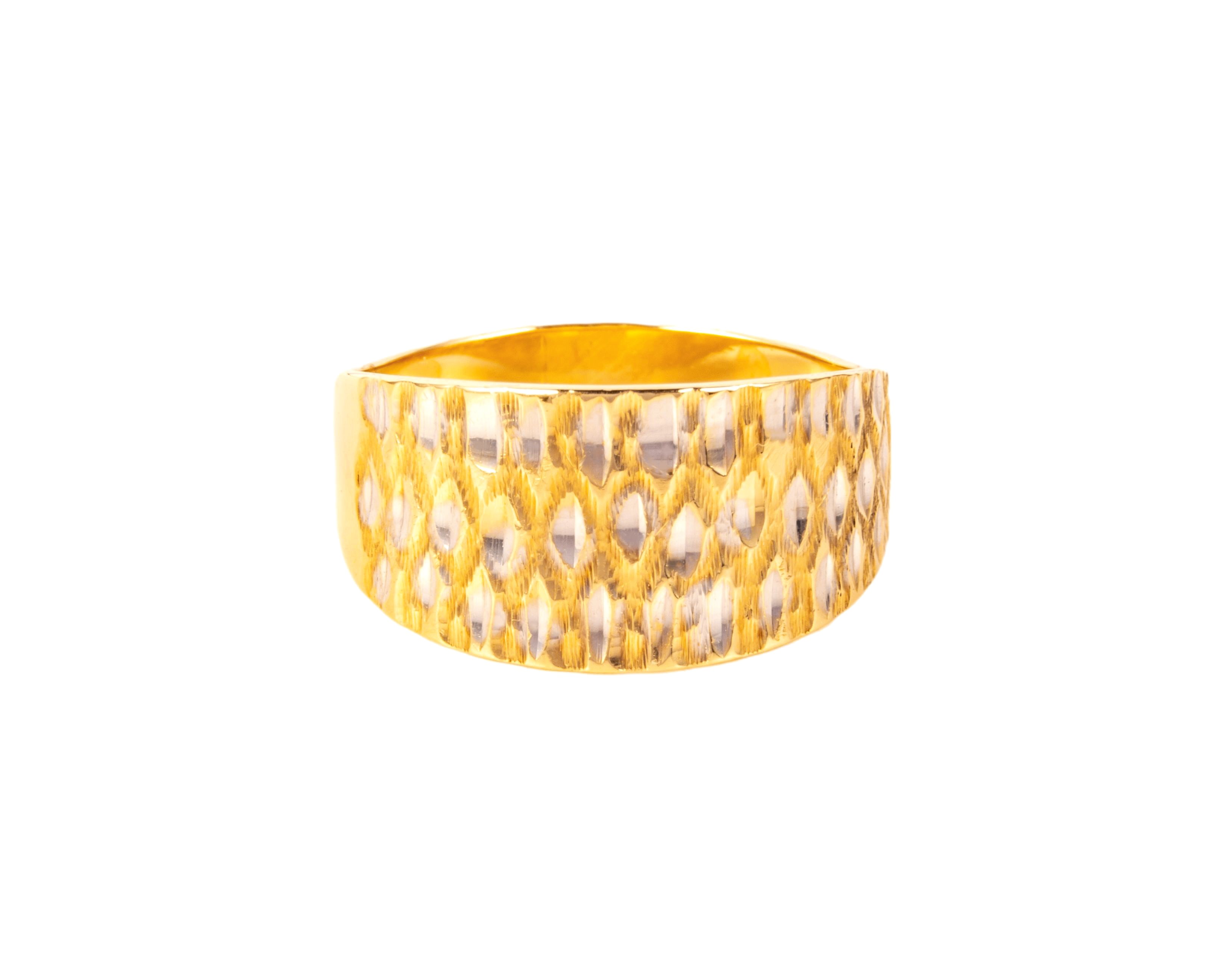 Przedstawiamy ponadczasowy pierścionek z żółtego złota próby 3, tj. 585, który wyróżnia się efektownymi zdobieniami na froncie. Pierścionek ma rozmiar 11.