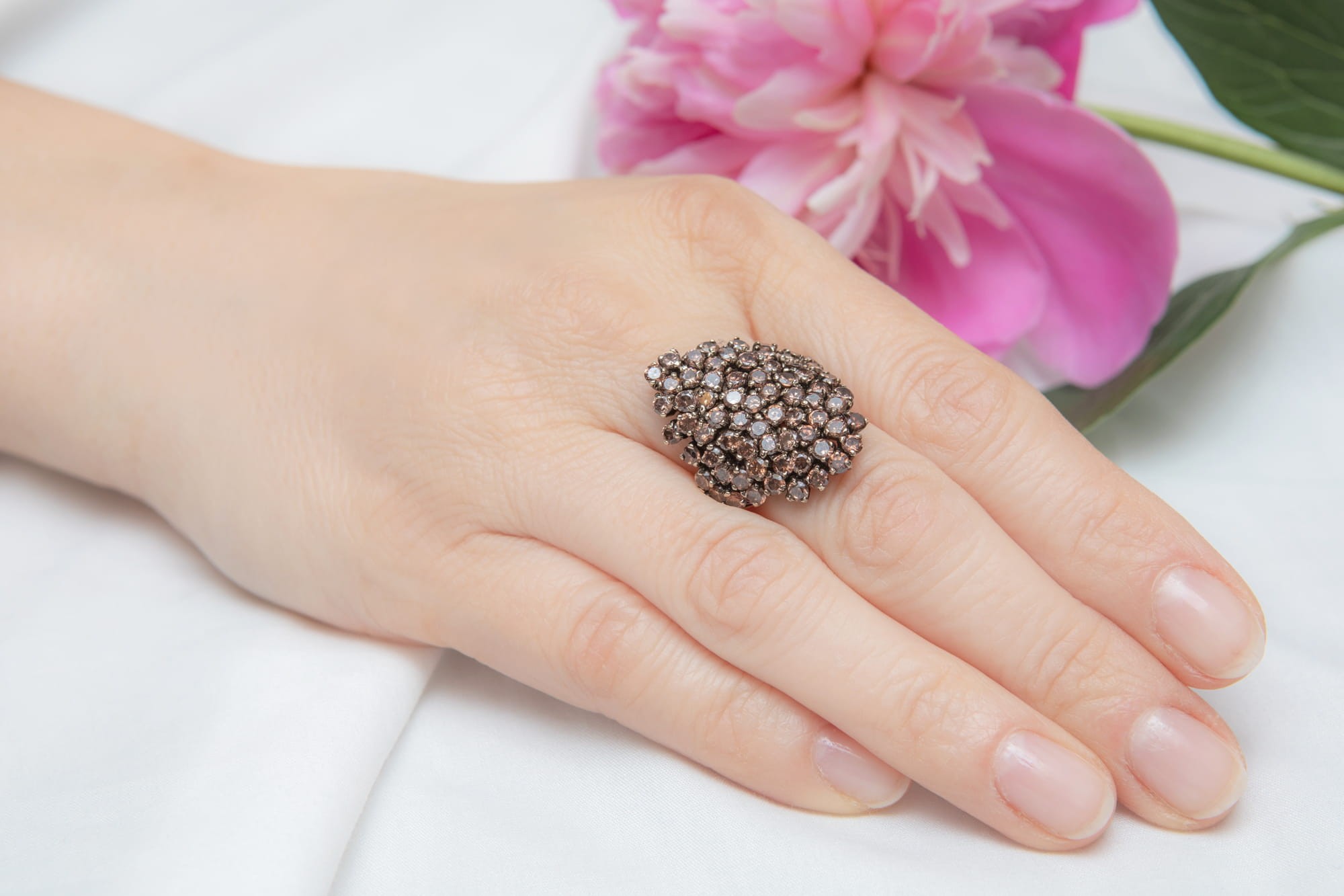 Pierścionek ze złota z brązowymi cyrkoniami, których oprawy pokryto czarnym rodem - co daje ciekawy efekt podbijający kolor cyrkonii. Kamienie ułożone są w oryginalny kształt przypominający chustkę. Całość wykonana z żółtego złota wysokiej próby 2, tj. 750. Pierścionek ma rozmiar 15.