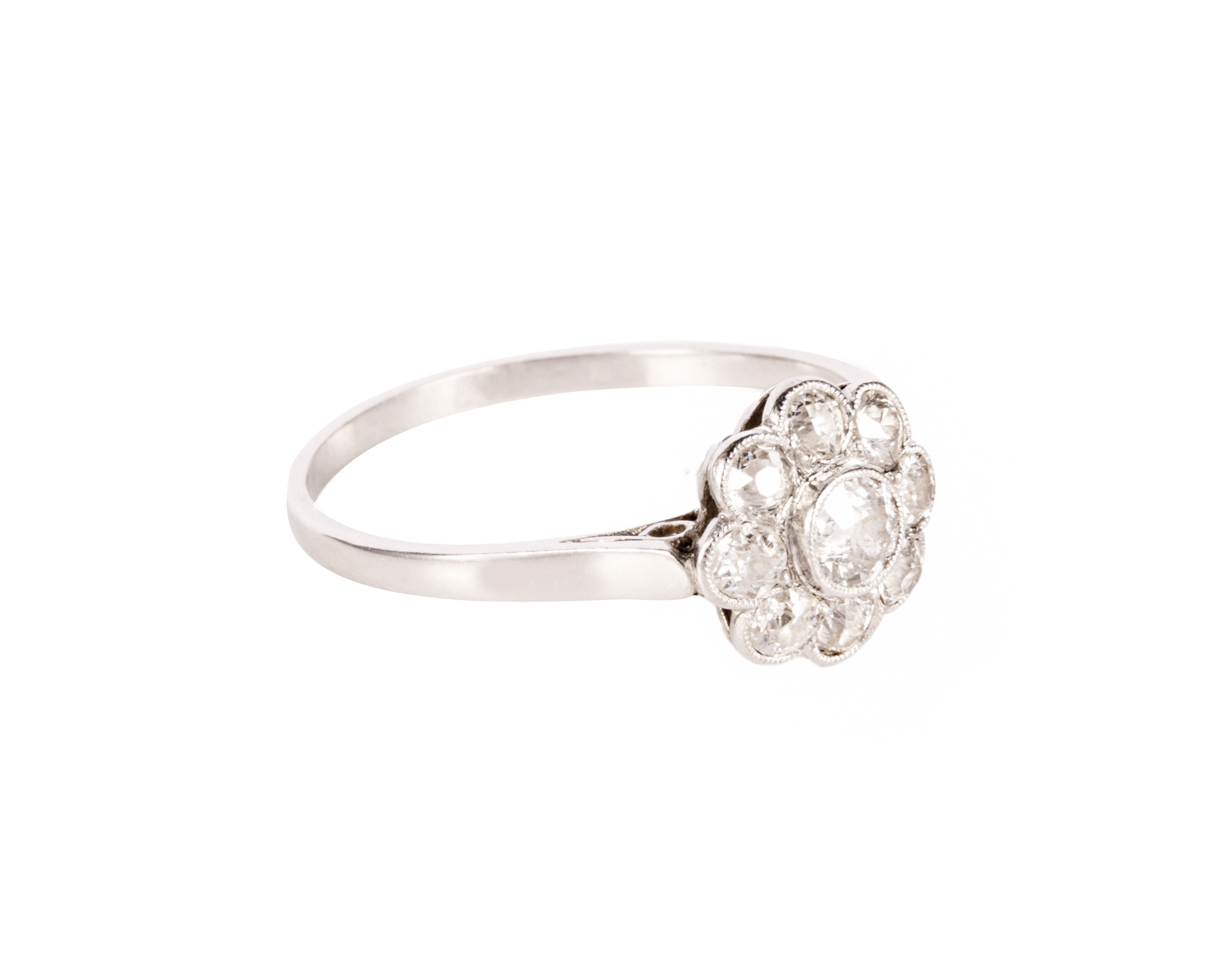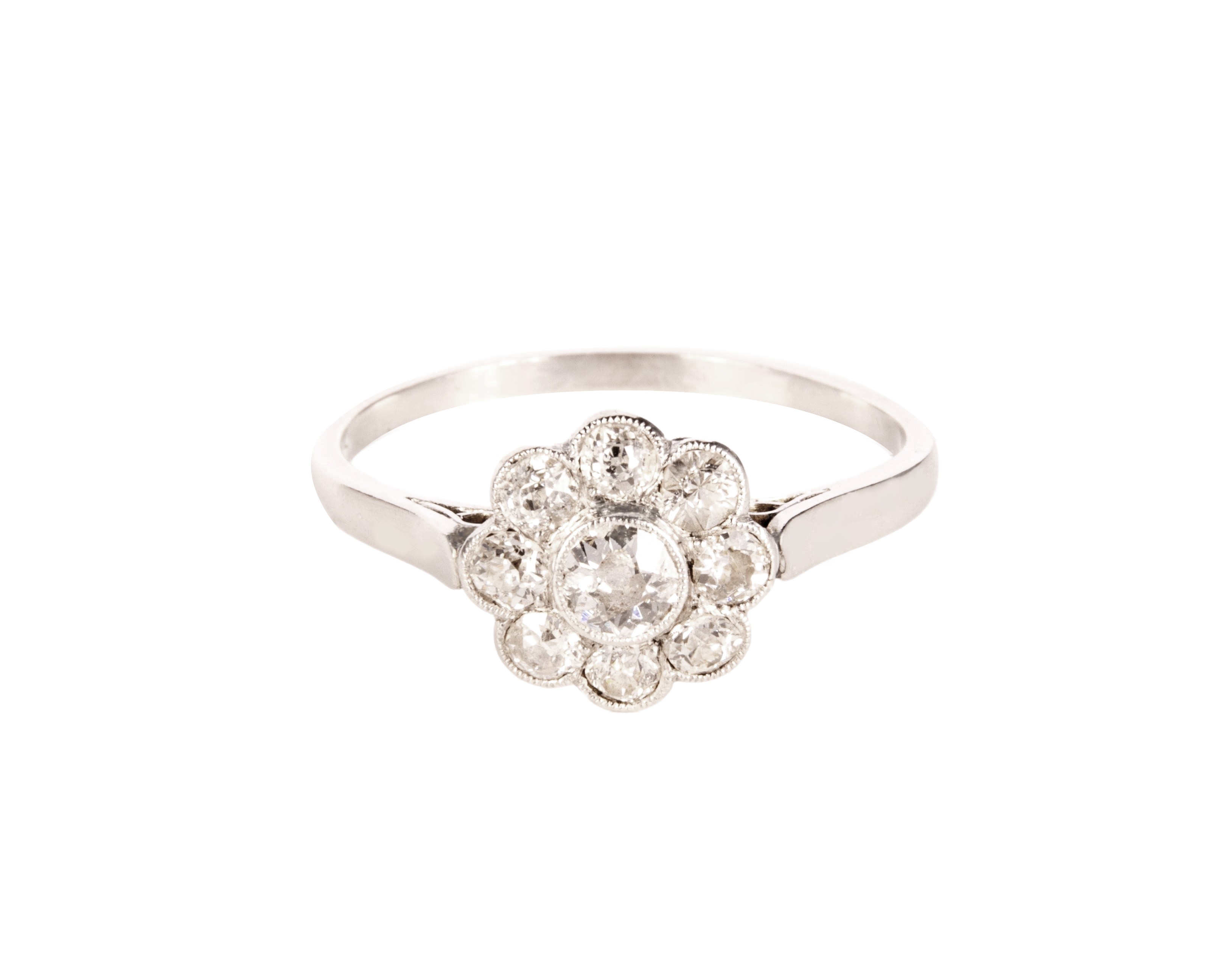 Platynowy pierścionek typu daisy, wysadzany brylantami, z czego centralny ma ok. 0,15 karata. Łączna masa brylantów to ok. 0,44 karata, czystość VS-Si oraz barwę H. Rozmiar pierścionka to 16,5. Wyrób posiada świadectwo badania z Urzędu Probierczego, według którego szynę pierścionka wykonano z platyny próby 950 a oprawy kamieni z platyny 850-900 (świadectwo dołączone do pierścionka).