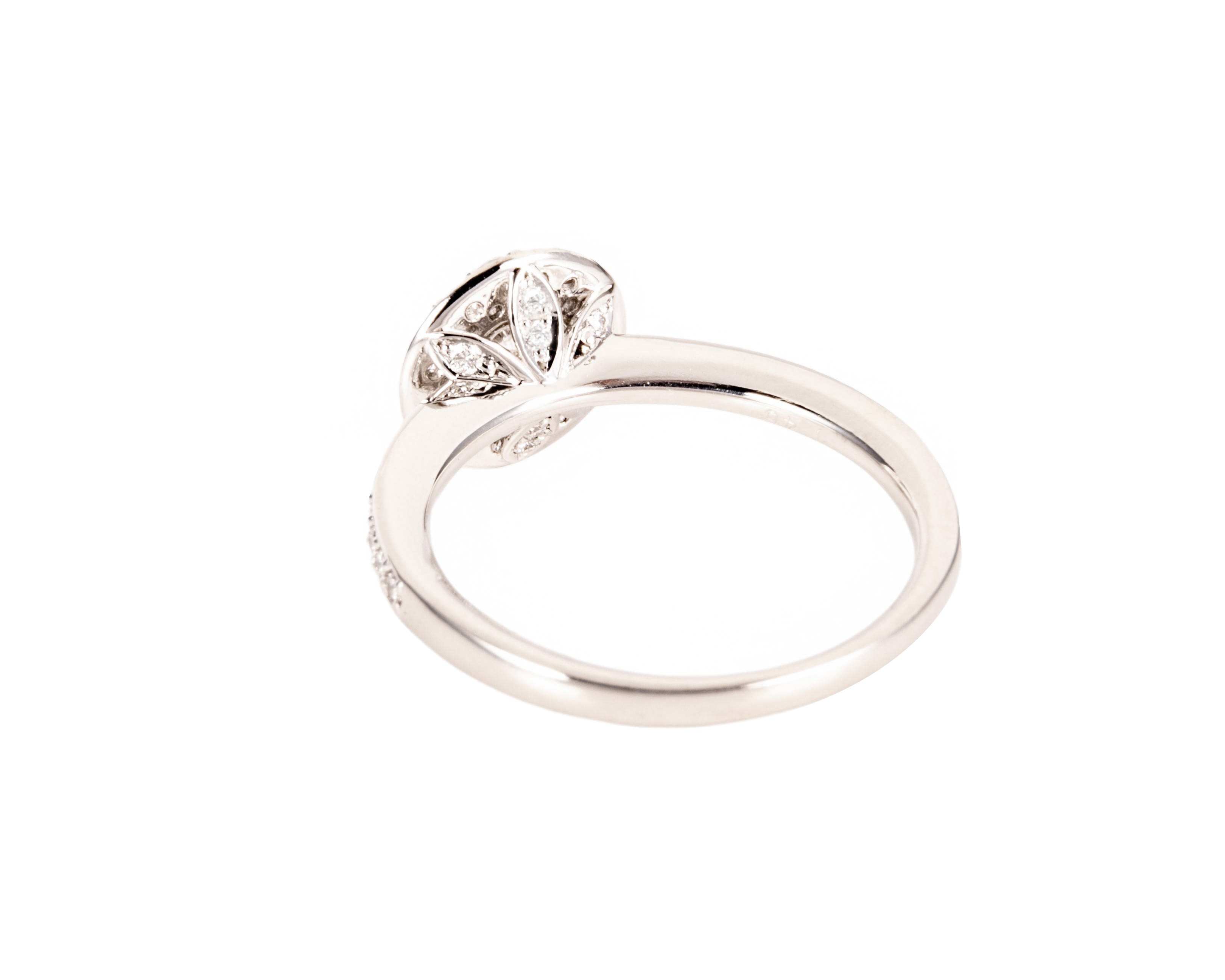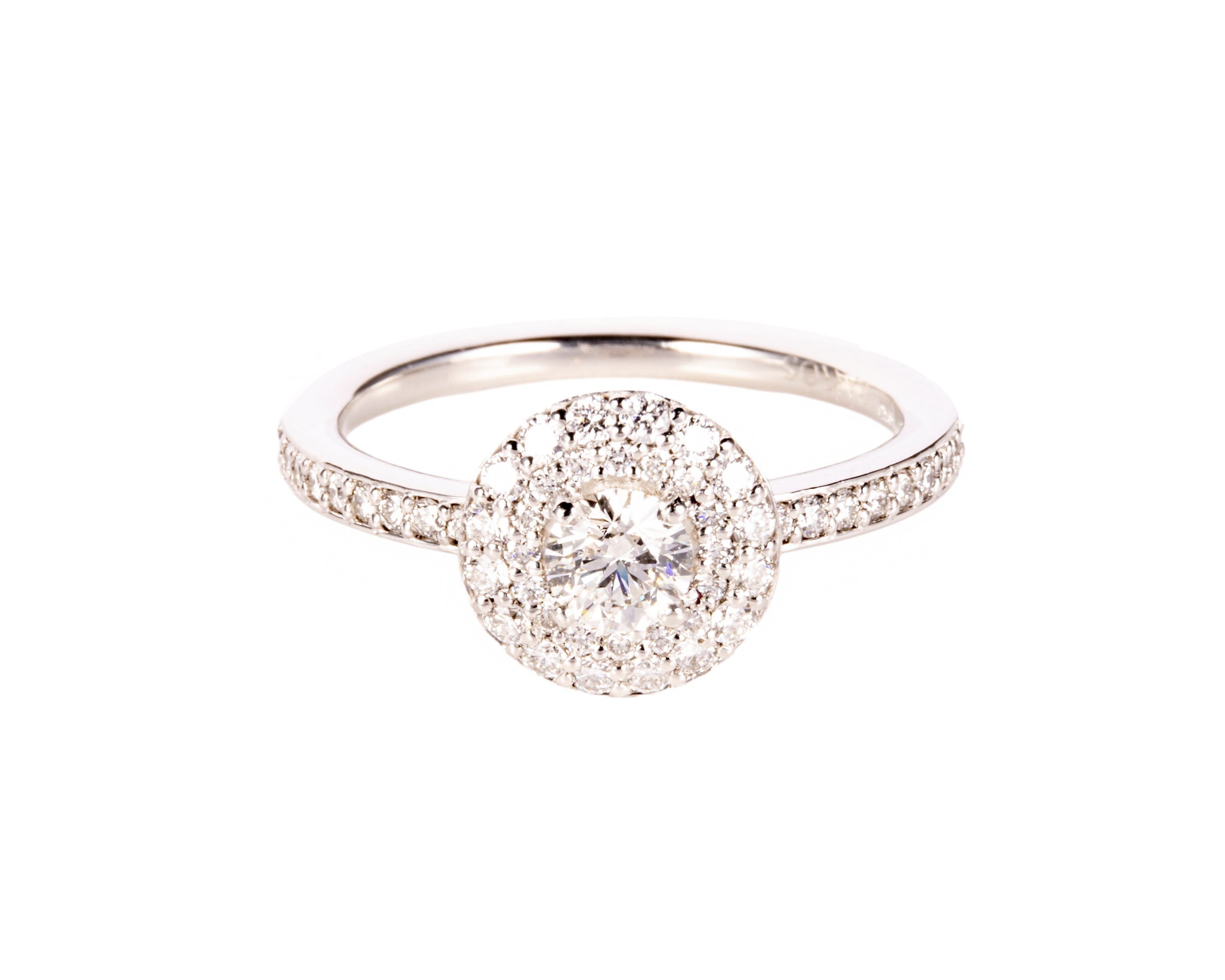 Pierścionek wykonany z platyny próby 950, wysadzany brylantami. Centralny ma masę ok. 0,25 karata, a pozostałe 58 sztuk zakutych jest zakutych w kornie pierścionka, szynie oraz w ażurowych zdobieniach od spodu korony. Czystość brylantów mieści się w przedziale VS1 - Si, a barwa G - H. Pierścionek ma rozmiar 13.
