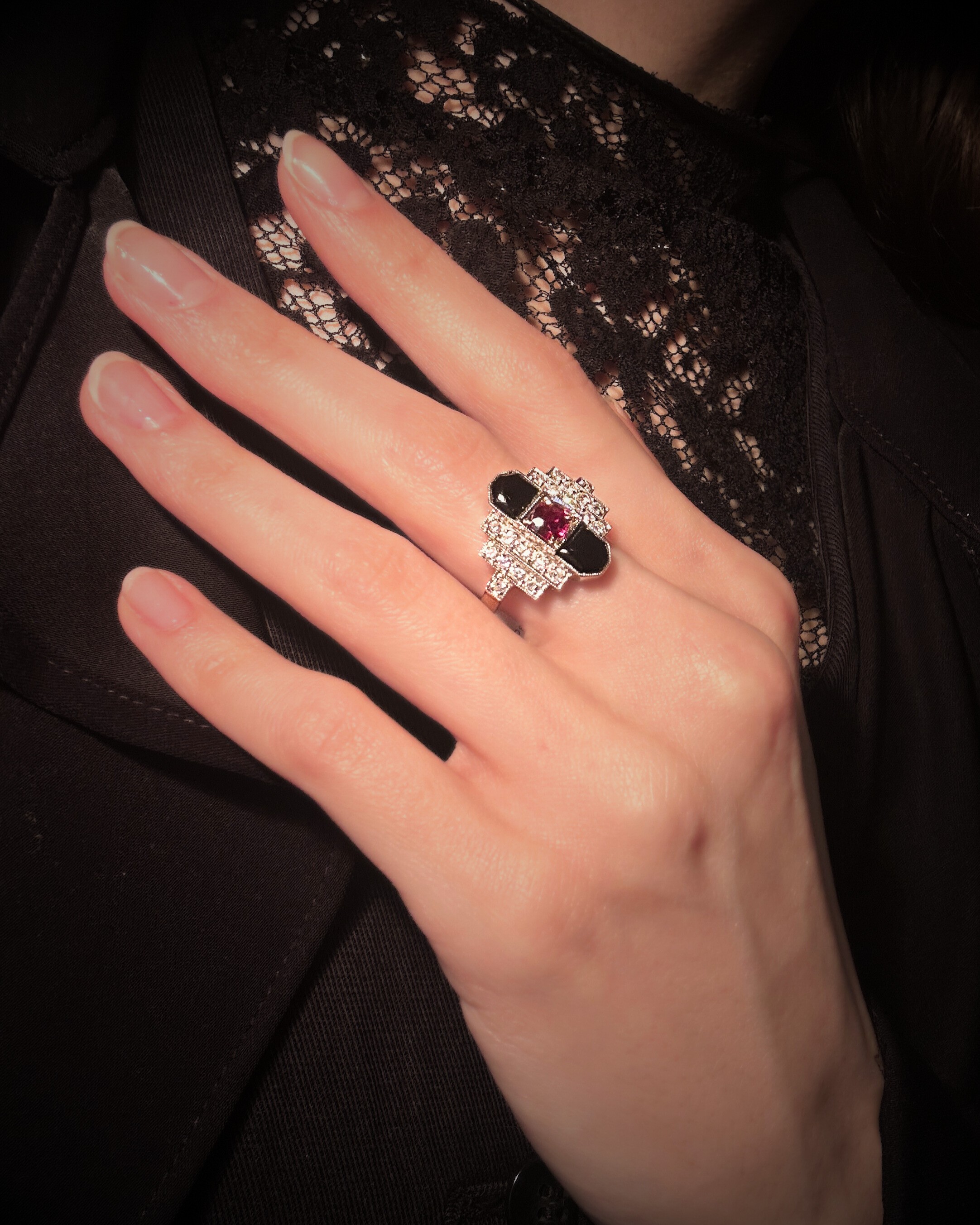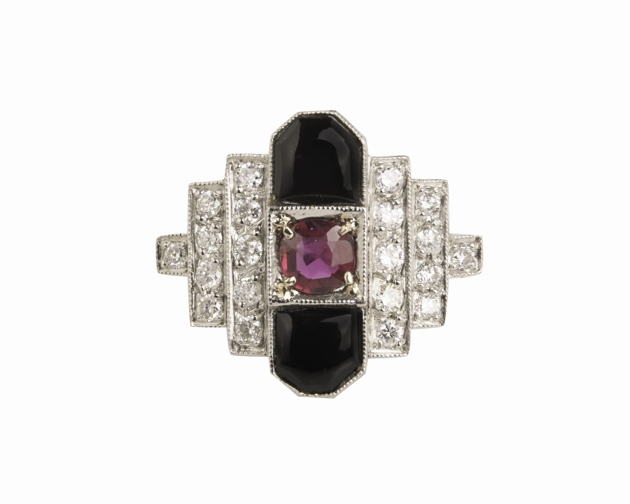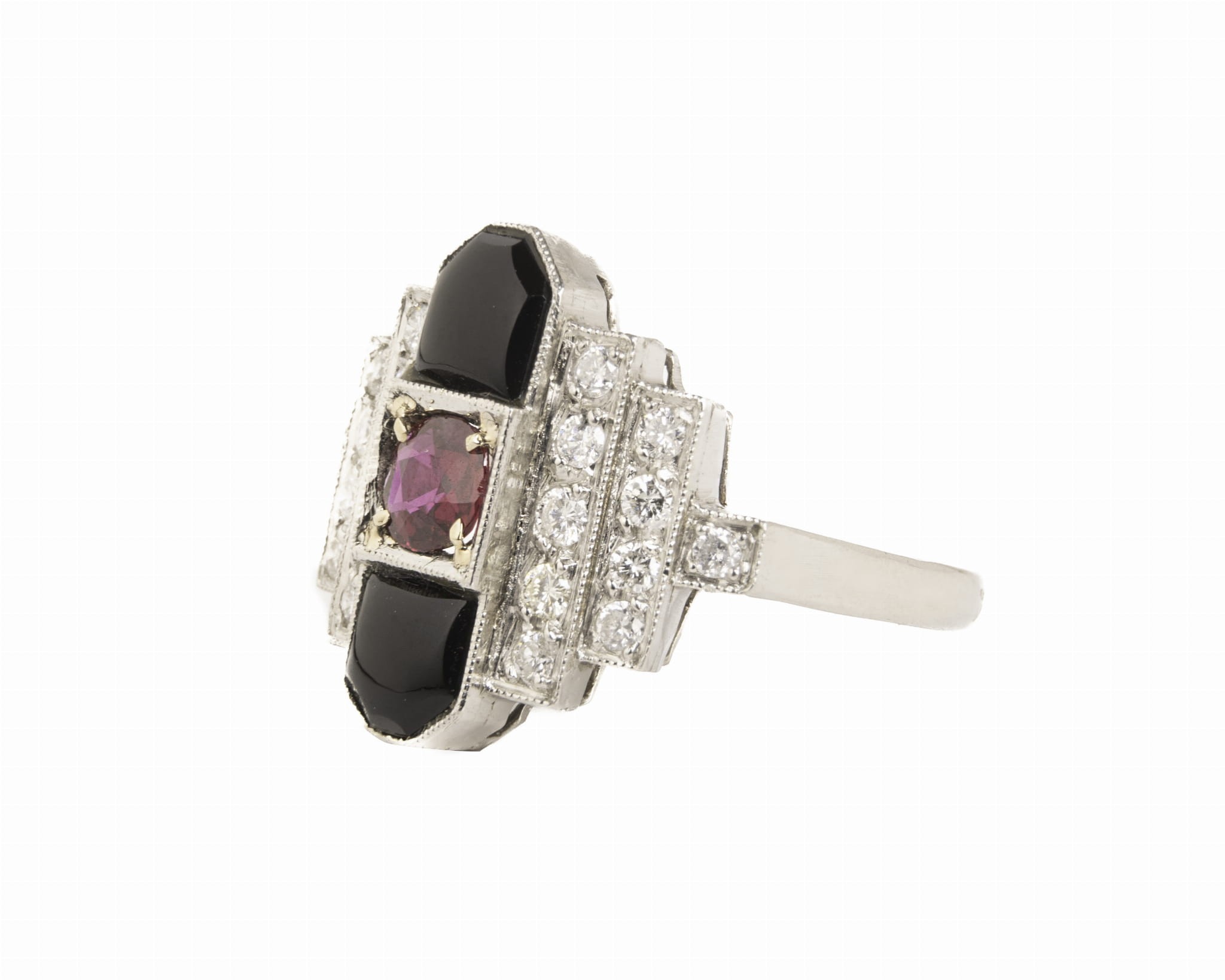 Pierścionek z symetrycznie osadzonymi kamieniami o łącznej masie ok. 0,5 karata. W centralnej części pierścionka znajduje się rubin, obok niego 2 onyksy i symetrycznie po bokach rozstawione diamenty. Wyrób wykonany w platynie próby 850.