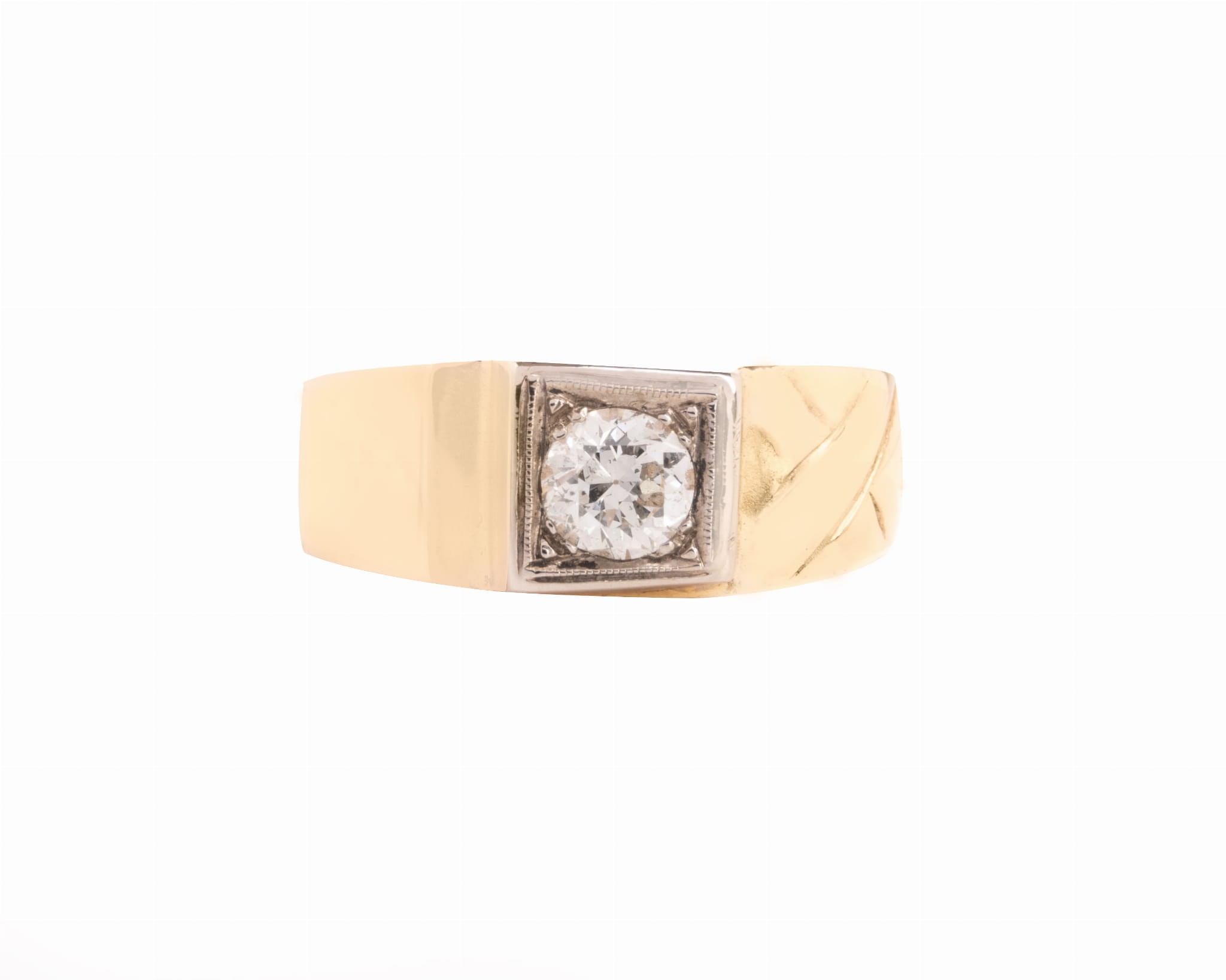 Złoty sygnet z brylantem wielkości ok. 4,5 x 3,08 mm o masie ok. 0,38 karata. Jedna strona obrączki z przodu sygnetu jest dodatkowo zdobiona.