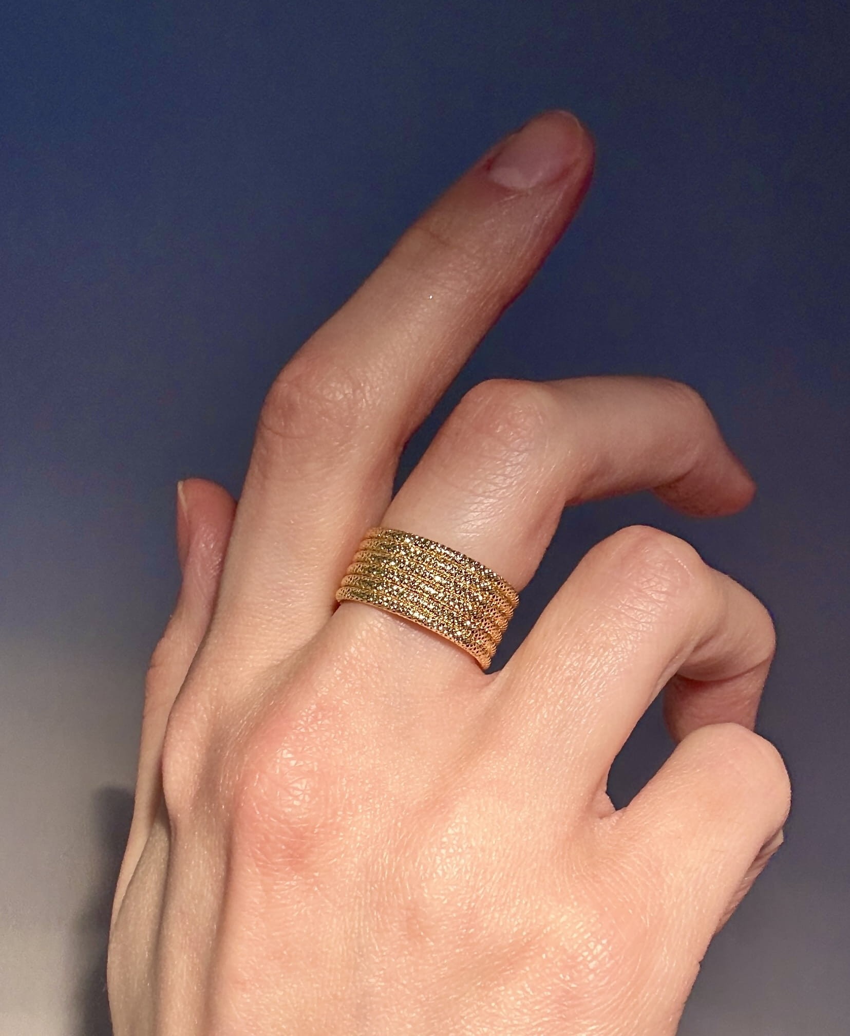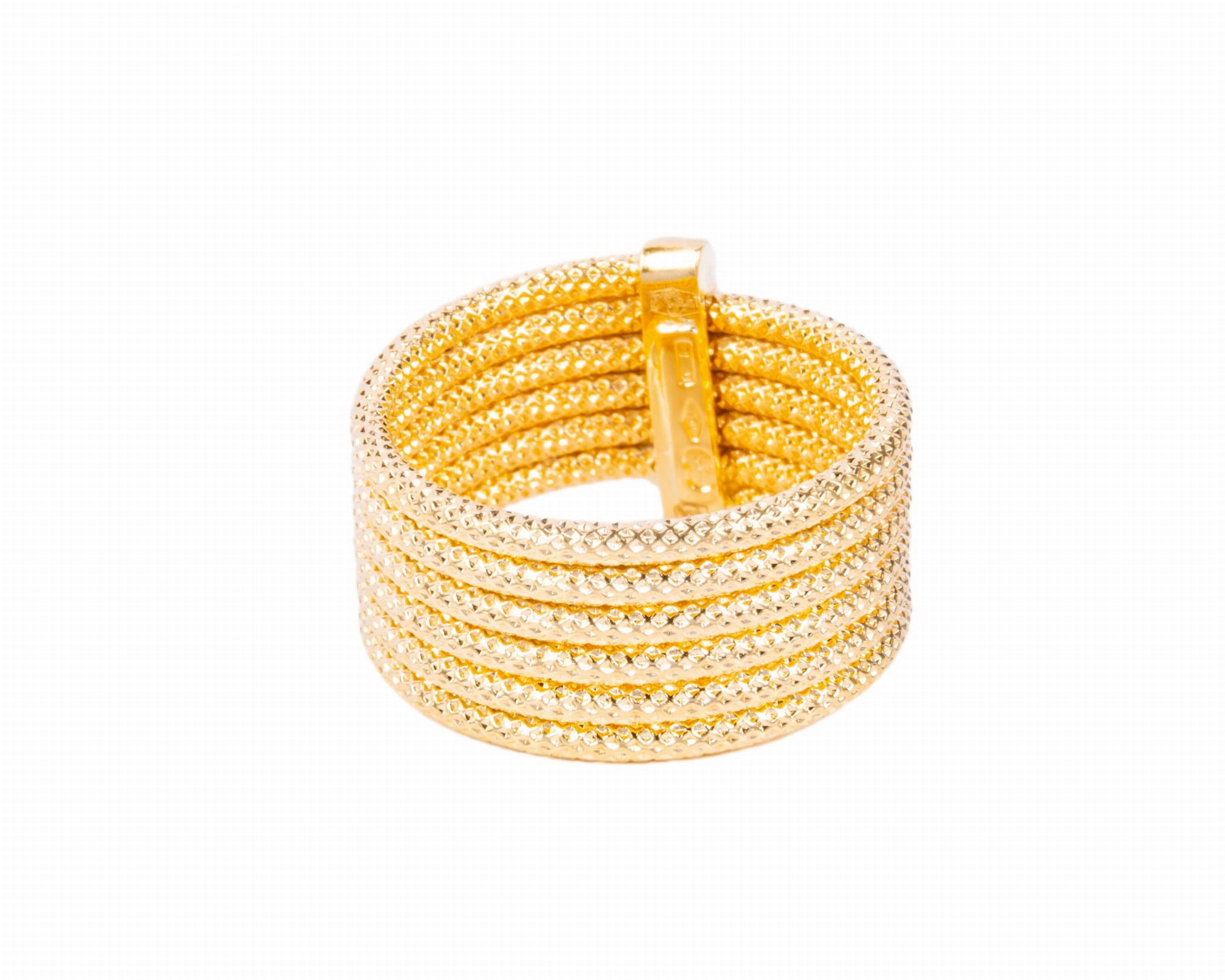 Pierścionek w formie szerokiej obrączki złożonej z 6 rzędów połączonych z tyłu, całość zrobiona z żółtego złota wysokiej próby 750. Pierścionek obejmuje rozmiary 10-12.