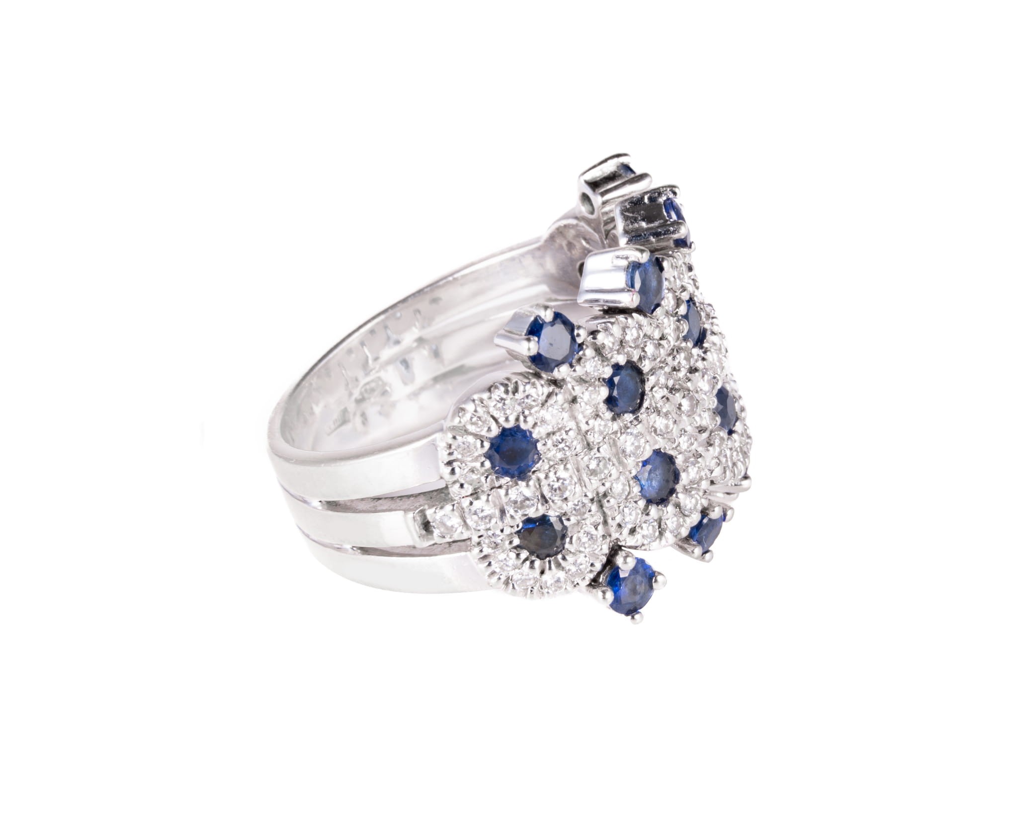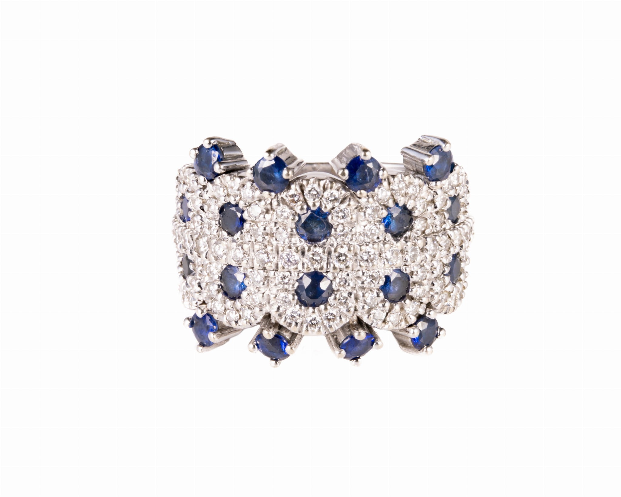 Pierścionek wykonany z białego złota 2 próby, tj. 750, z szafirami i diamentami. Osiem bocznych szafirów są zakute w ruchomych oprawach.
