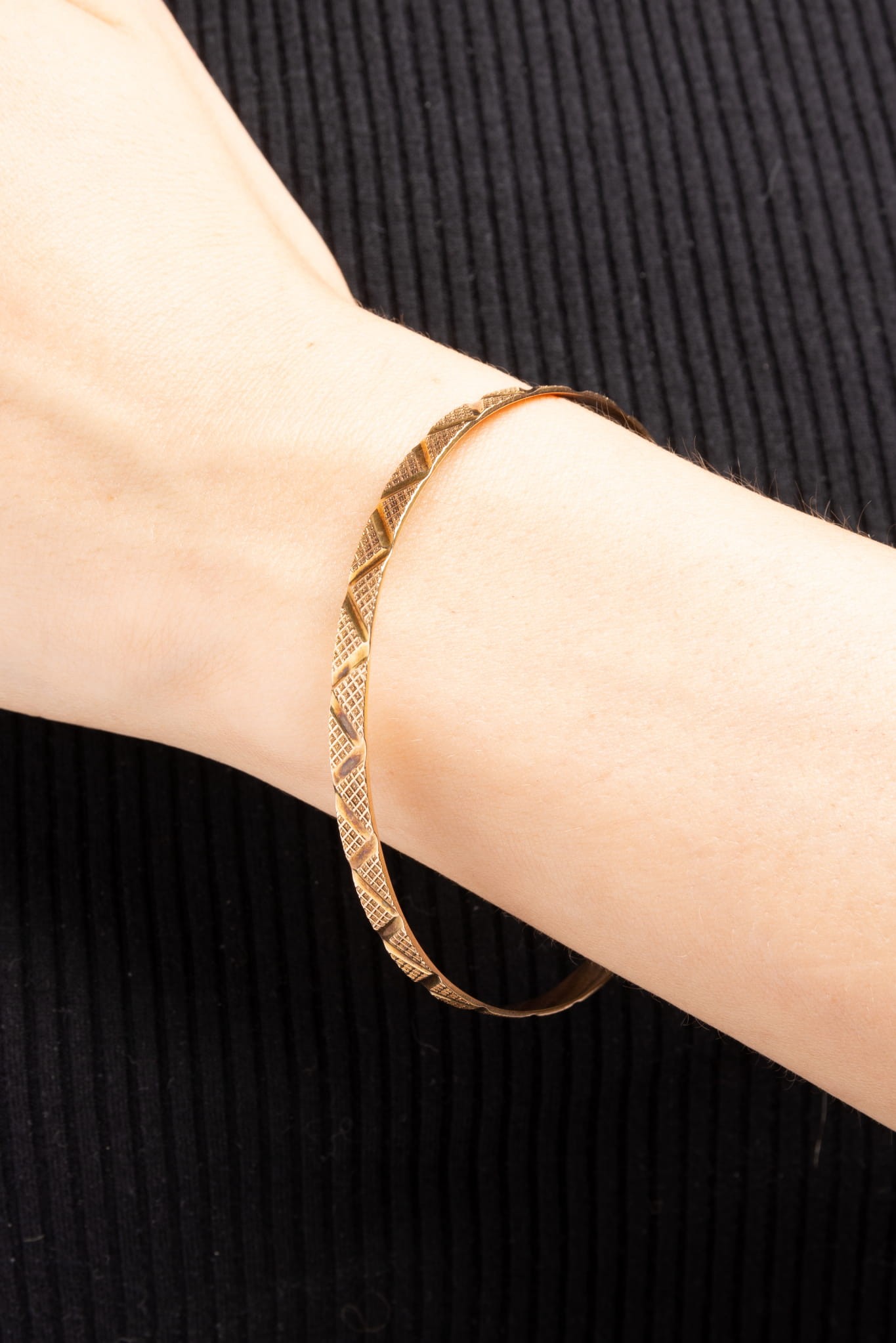 Klasyczna ozdoba w formie sztywnej, okrągłej bransolety, całość wykonana w złocie próby 585 o średnicy ok. 7 cm. Od zewnętrznej strony bransoleta ma geometryczne zdobienia.