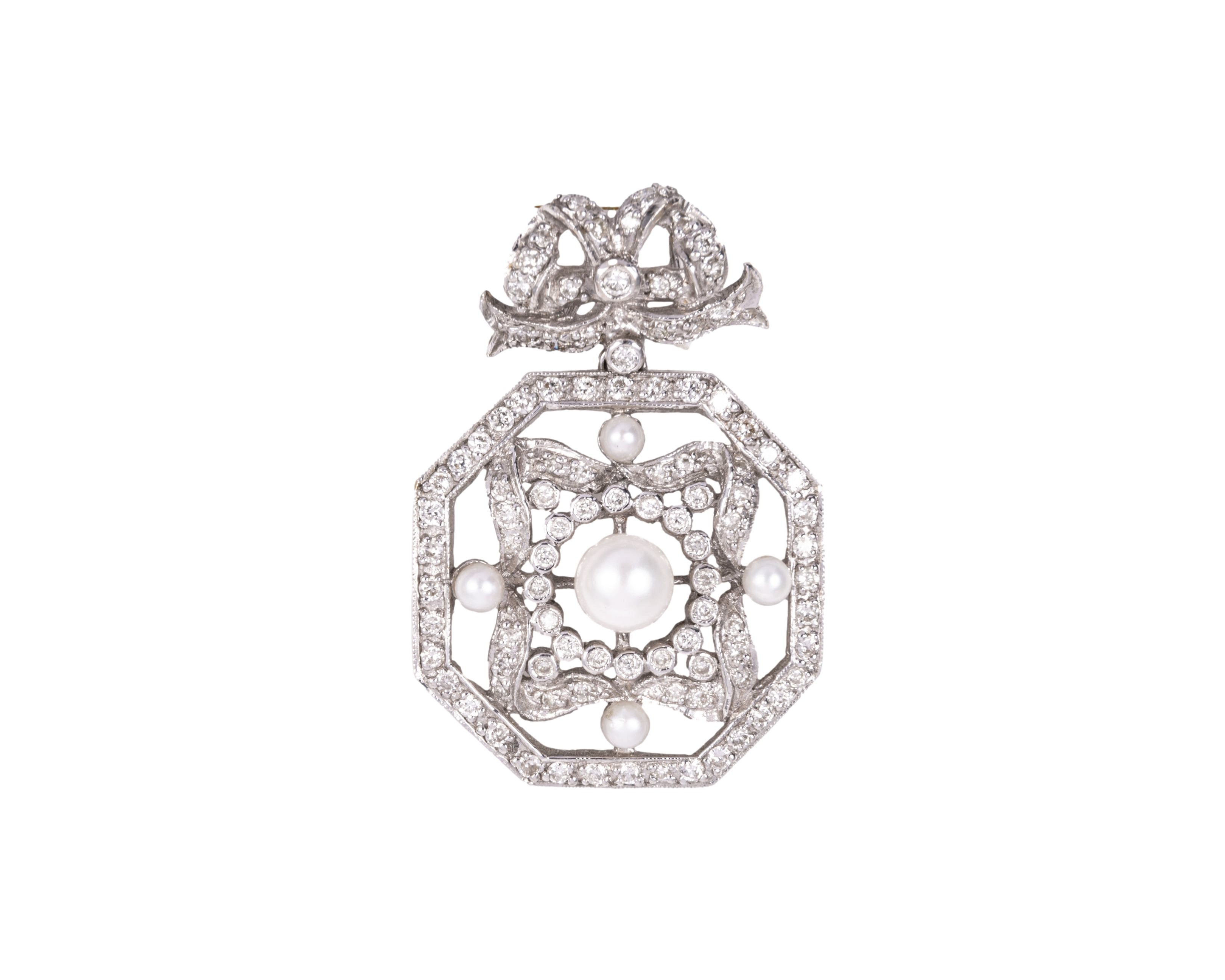 Piękny wyrób jubilerski - wisior wykonany z białego złota próby 750, stylizowany na epokę edwardiańską. W całości zakuto łącznie 100 brylantów o średnicy ok. 1,5 mm, łączna masa diamentów to ok. 1,5 karata, czystość kamieni to Si i barwy H-J. Oprócz brylantów mamy tu jeszcze 5 pereł. Wymiary wisiora to ok. 3,5 x 2,5 cm.