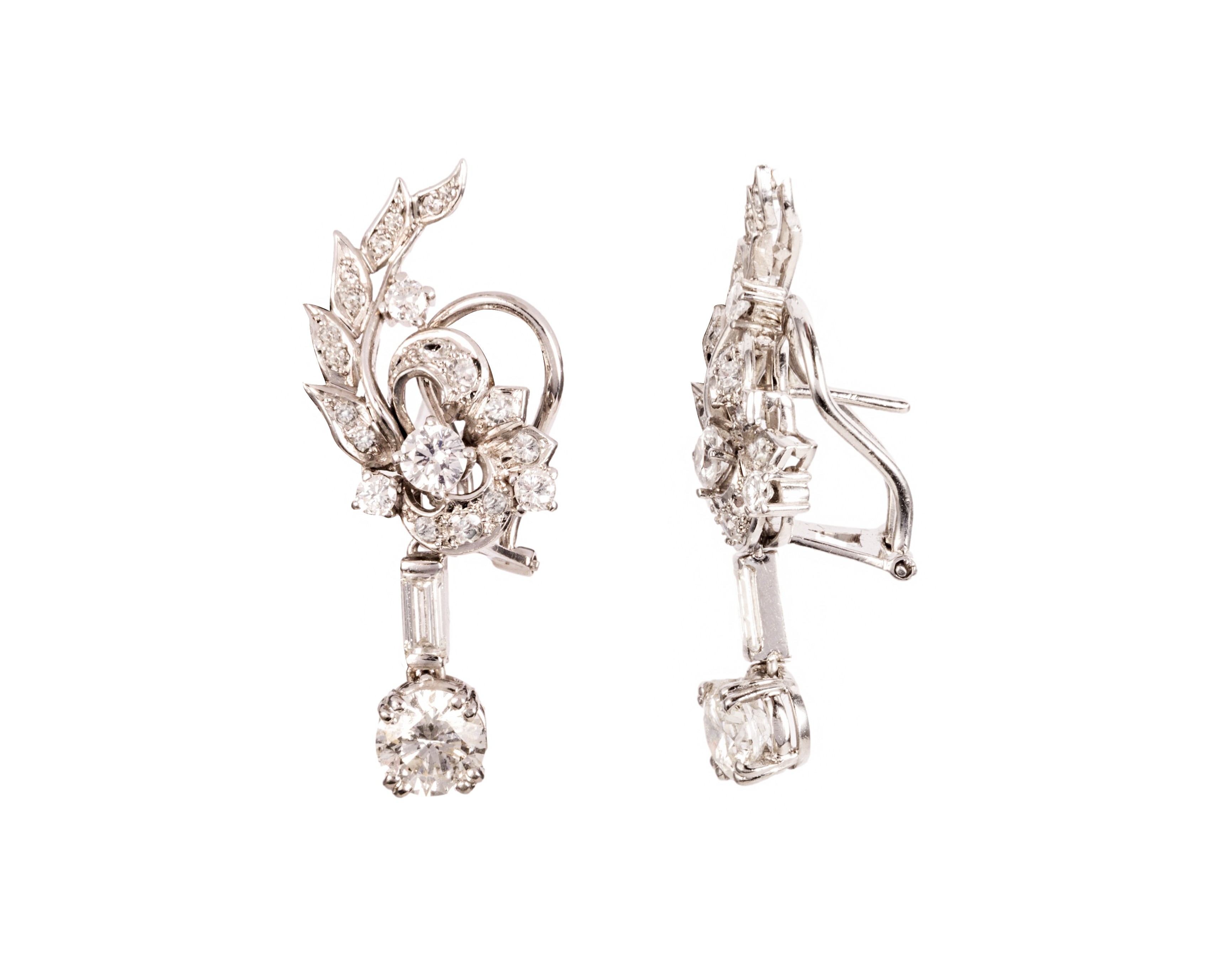 Niesamowite kolczyki dla miłośniczki diamentowego blasku - w tej parze kolczyków łącznie mamy ok. 3,65 karata. Okrągłe diamenty mają łącznie ok. 2 karatów, ich czystość mieści się w przedziale Si2-P1, a barwa od K do L. Diamenty w prostokątnym szlifie, tzw. bagiety, mają łącznie ok. 1,65 karata, czystość w przedziale VS1-P1, a barwę od G do I. Pozostałe diamenty są w szlifie ósemkowym. Do kolczyków dołączony jest certyfikat Polskiego Instytutu Gemmologicznego.