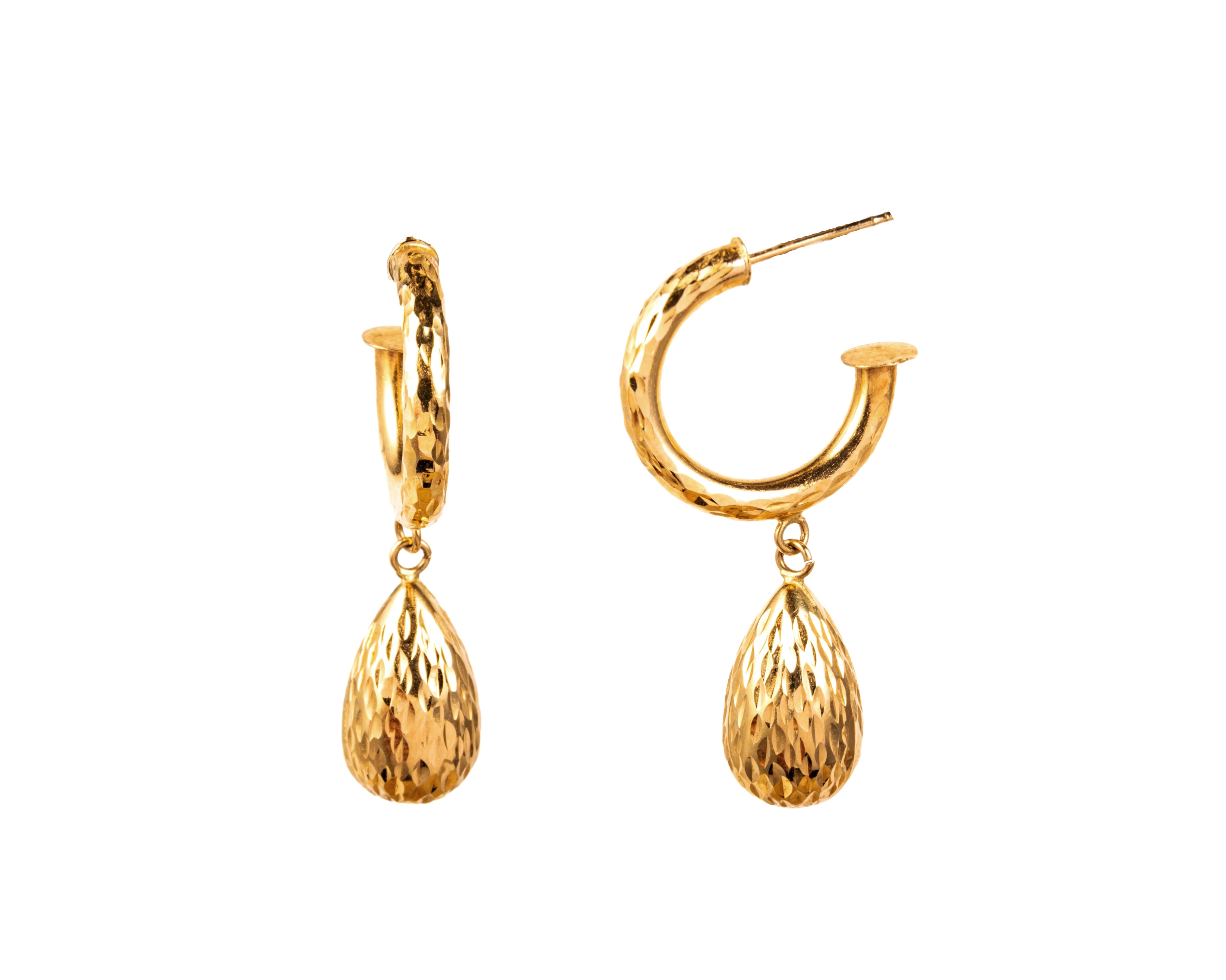 Para złotych kolczyków wiszących z zawieszkami, całość z ozdobną fakturką. Długość kolczyka to ok. 4 cm, na jednym kolczyku widać lekkie uszkodzenia. Do pary dołączone zatyczki z silikonu. Całość wykonana ze złota próby 585.