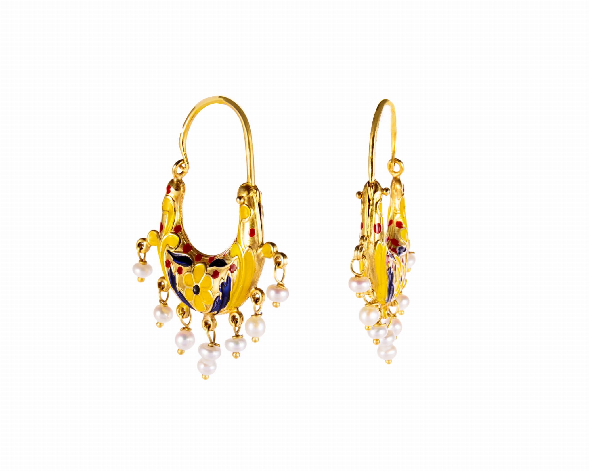 Ciekawa para wiszących kolczyków wykonanych w żółtym złocie próby 750. Kolczyki obustronnie są dekorowane motywem florystycznym wykonanym z emalii, całość dopełniają wiszące drobne perełki u dołu kolczyków.