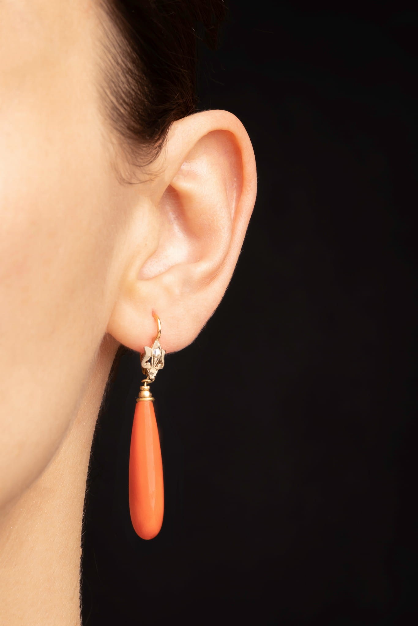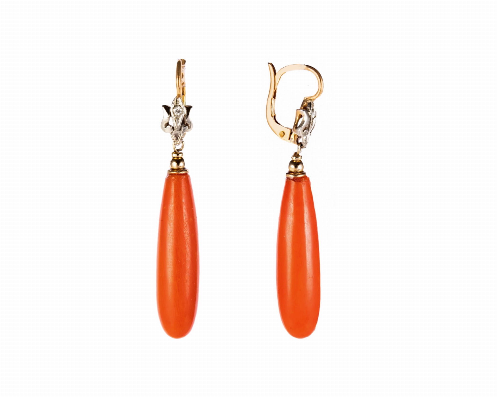 Wiszące kolczyki z podłużnymi koralami i diamentami zakutymi w górnej części kolczyków. Całość wykonana w złocie wysokiej próby 750.