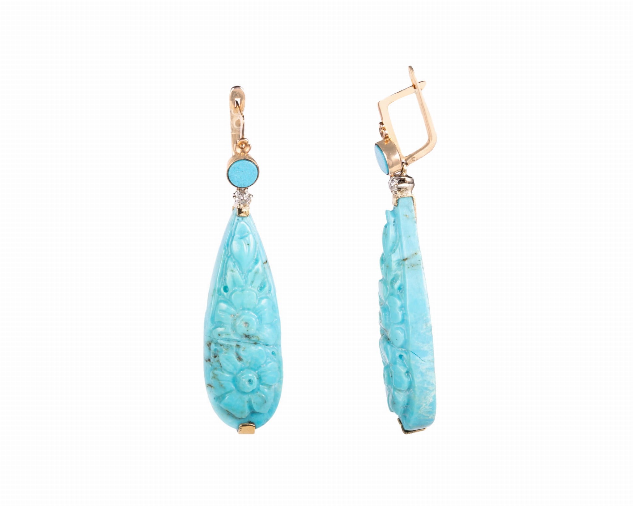 Wiszące kolczyki z rzeźbionymi turkusami w motyw kwiatów, długość kolczyka ok. 6,5 cm. Całość wykonana w żółtym złocie próby 583.