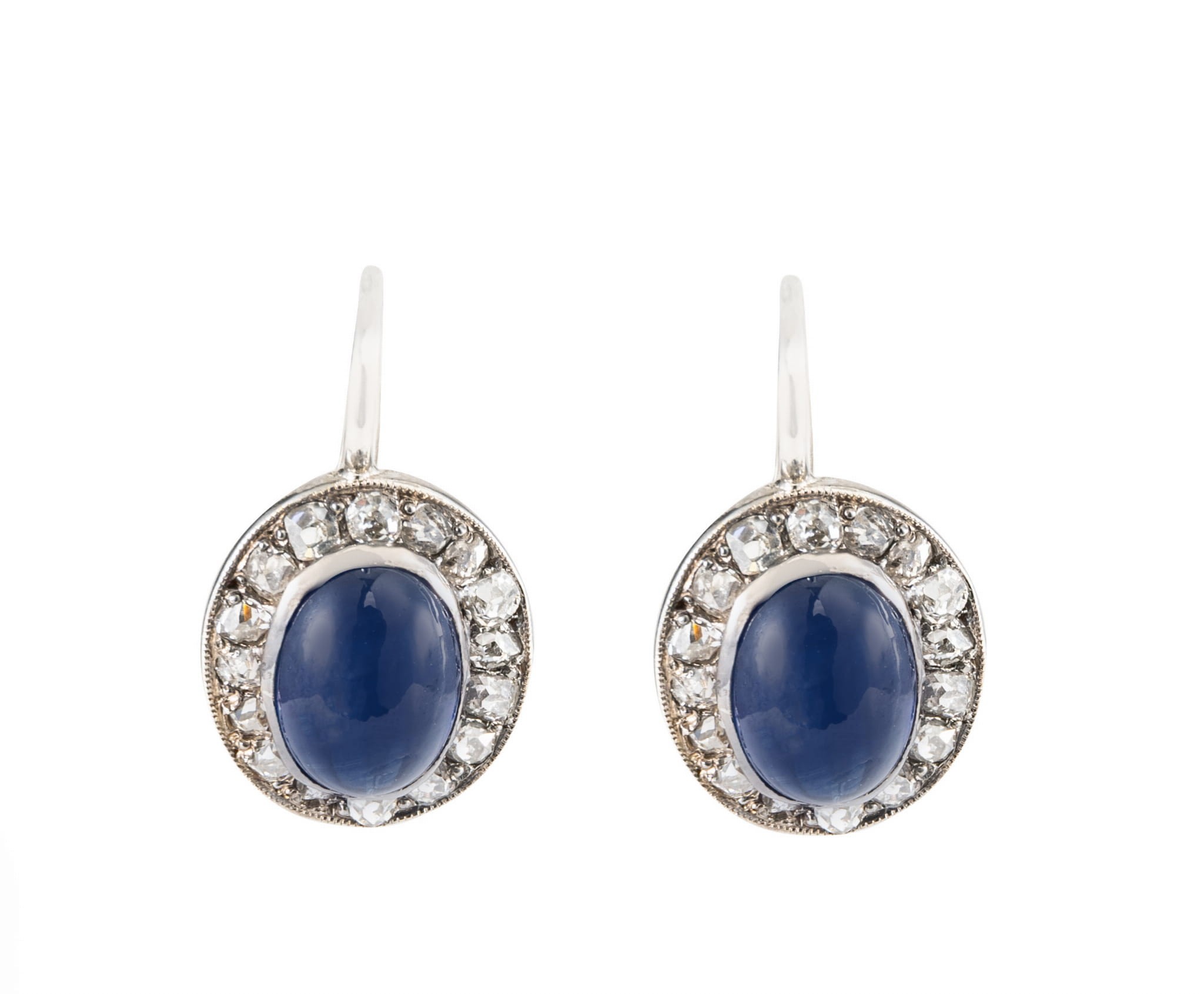 Para prześlicznych kolczyków wykonana w białym złocie próby 750, z centralnie osadzonymi szafirami w szlifie kaboszonowym o łącznej, przybliżonej masie 3,90 karatów. Dookoła centralnych kamieni zakuto łącznie 32 diamenty w starym szlifie, o masie ok. 0,40 karata. Kolczyki idealnie sprawdzą się do wieczorowych kreacji.