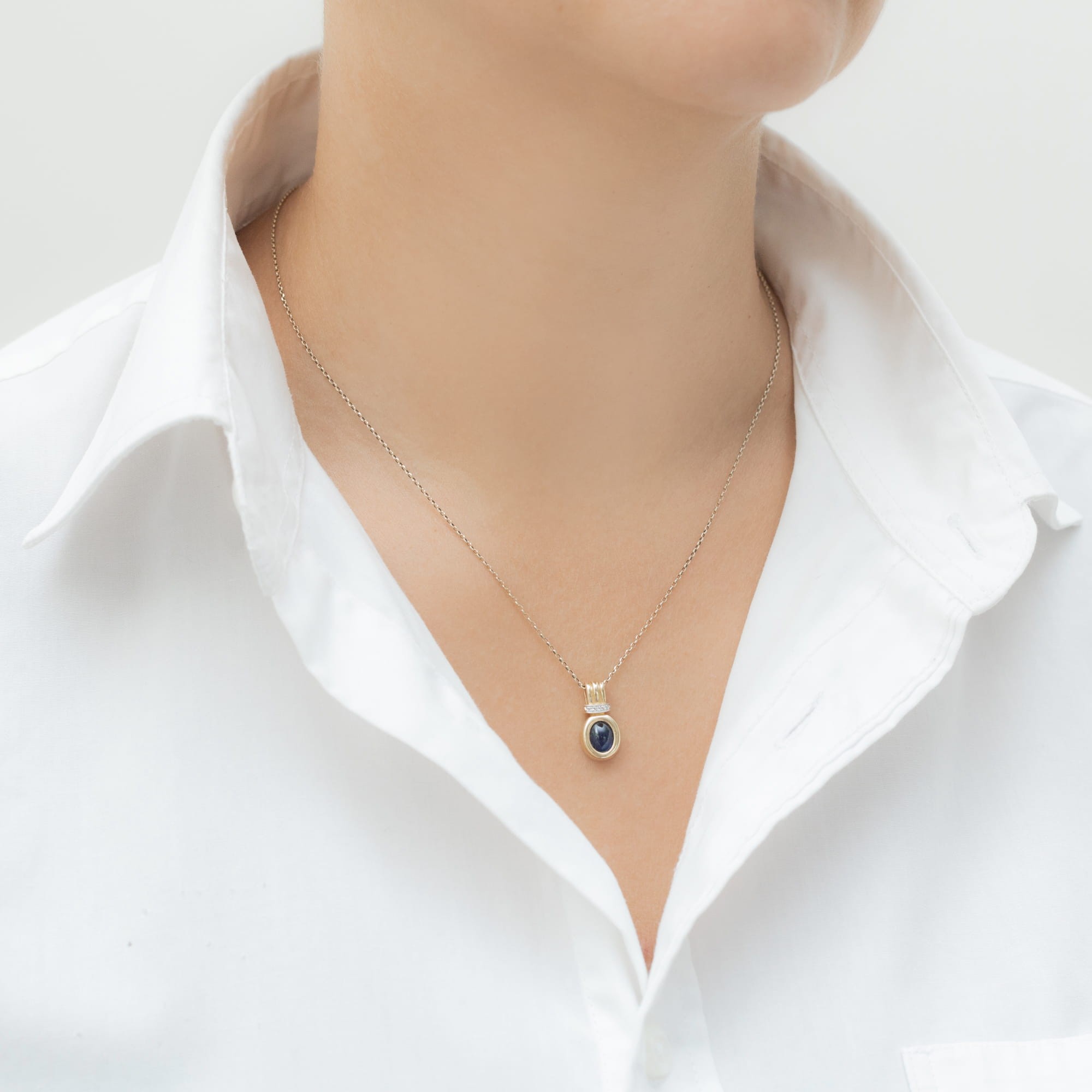 Owalna zawieszka z pięknym szafirem kaboszonem w żółtym złocie i z brylantami. Doskonałe uzupełnienie stylizacji.