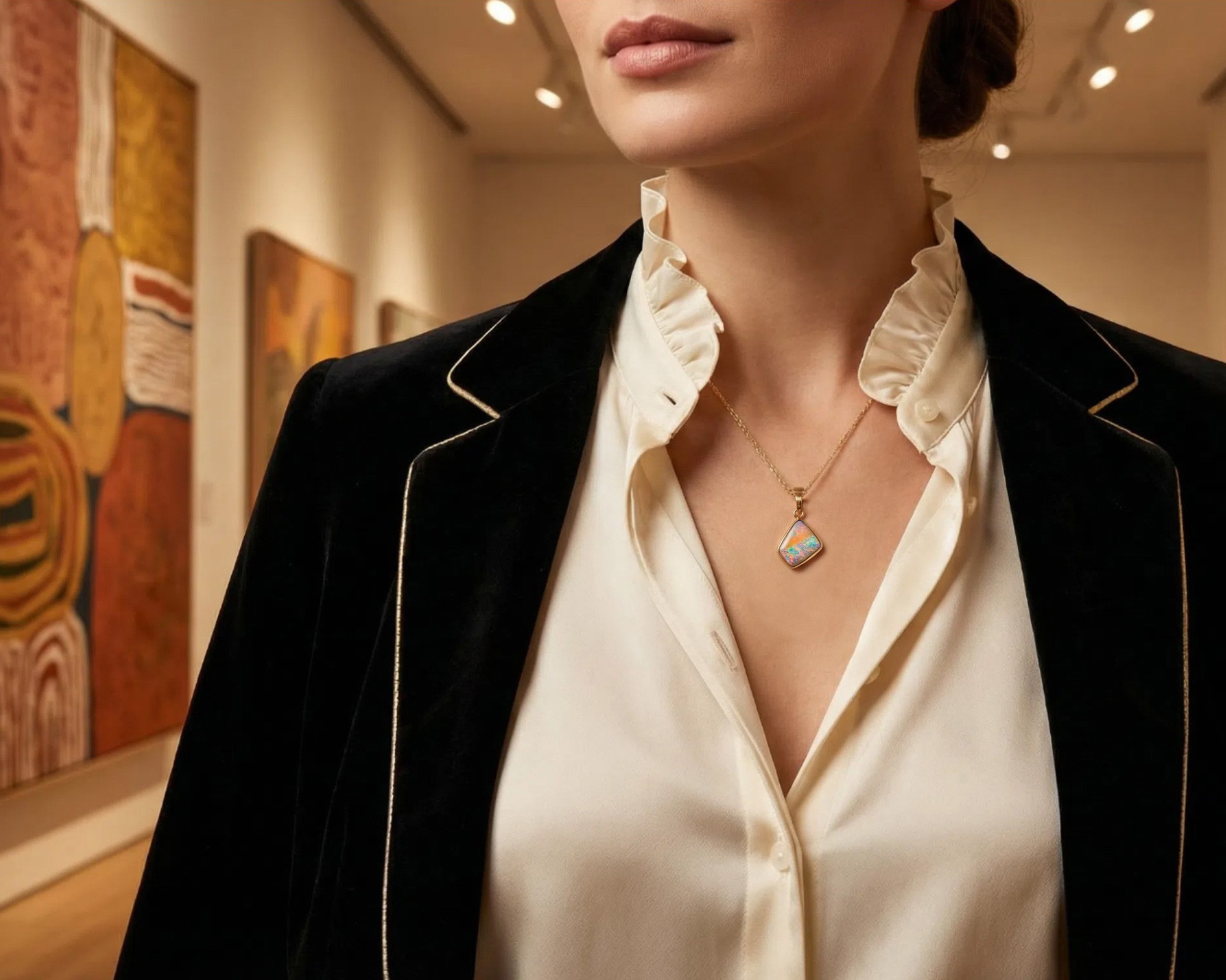 Ta złota zawieszka z opalem australijskim to harmonijne połączenie klasycznej elegancji z naturalnym pięknem. Delikatna forma, pastelowa kolorystyka i wysoka jakość wykonania czynią z niej biżuterię, która nigdy nie wyjdzie z mody. To nie tylko ozdoba, ale także fragment historii Ziemi, uchwycony w kamieniu, który powstawał przez miliony lat – prawdziwe dzieło natury oprawione w szlachetne złoto.