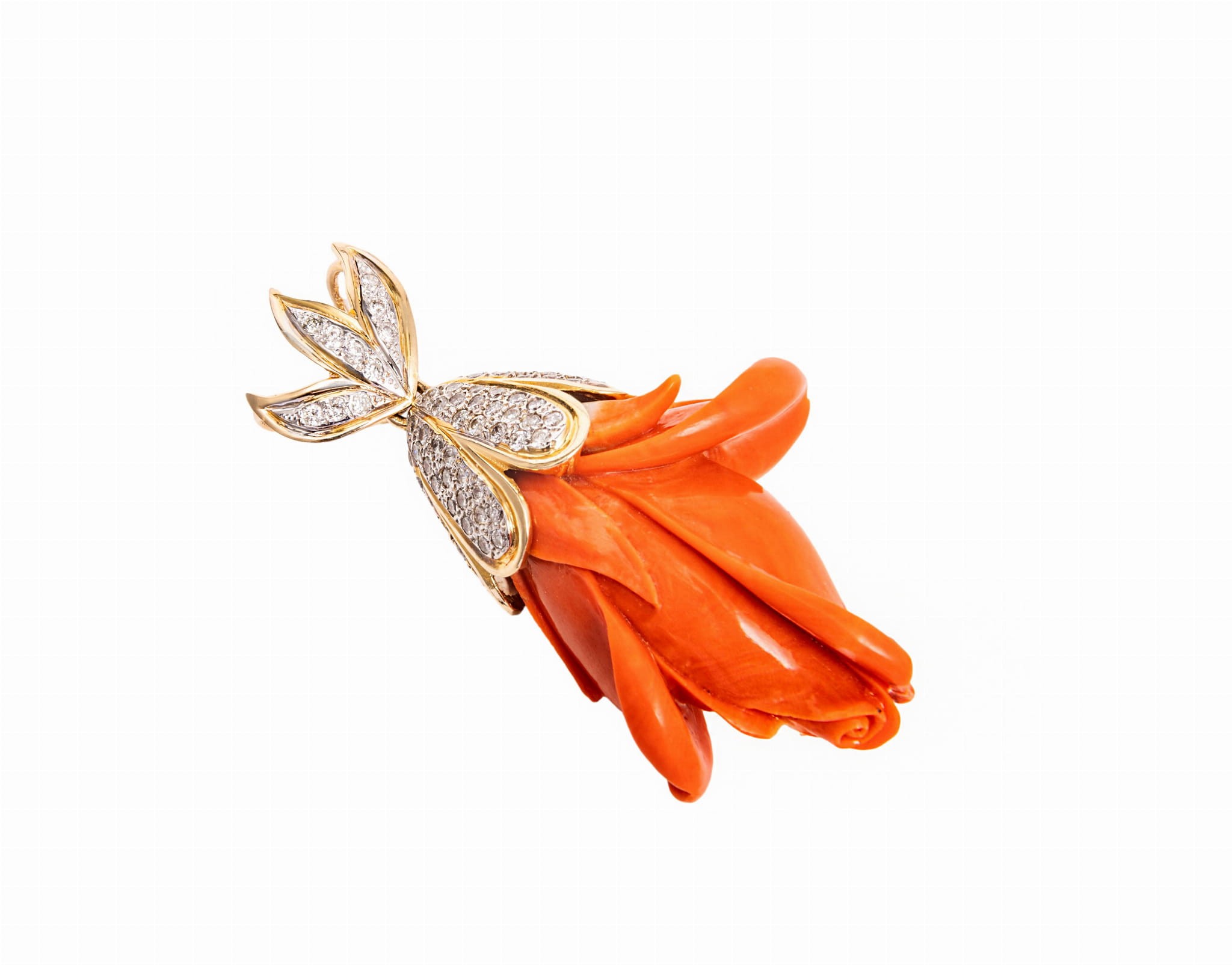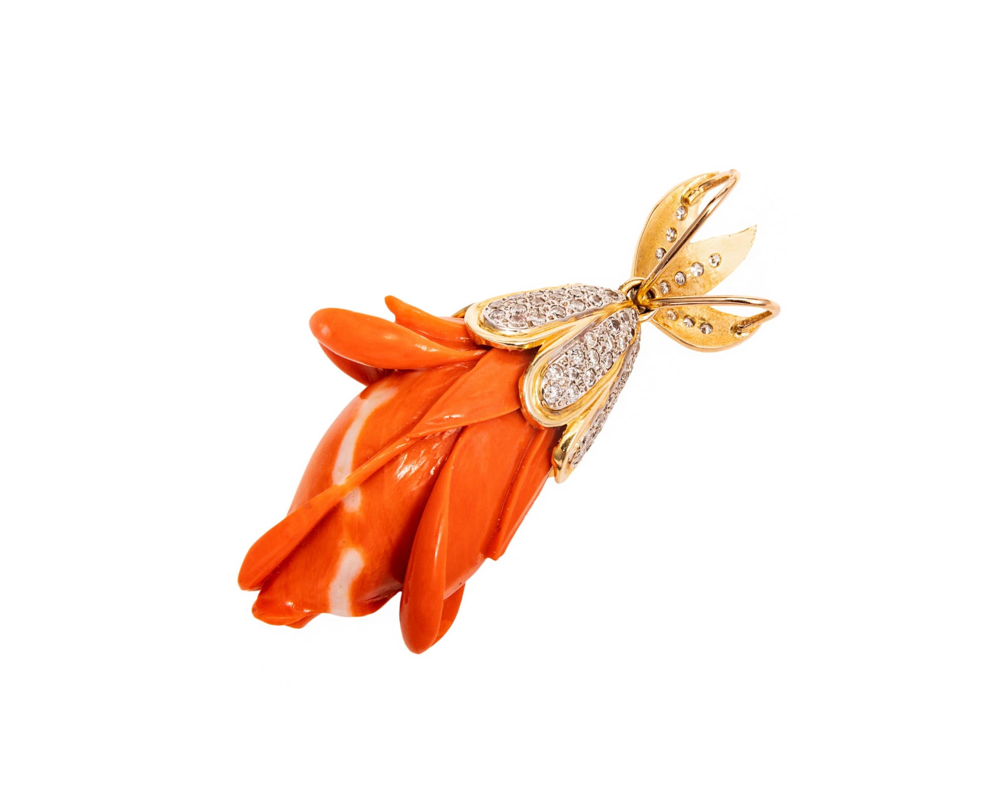 Zawieszka z rzeźbionego koralu w formie kwiatu, z diamentami