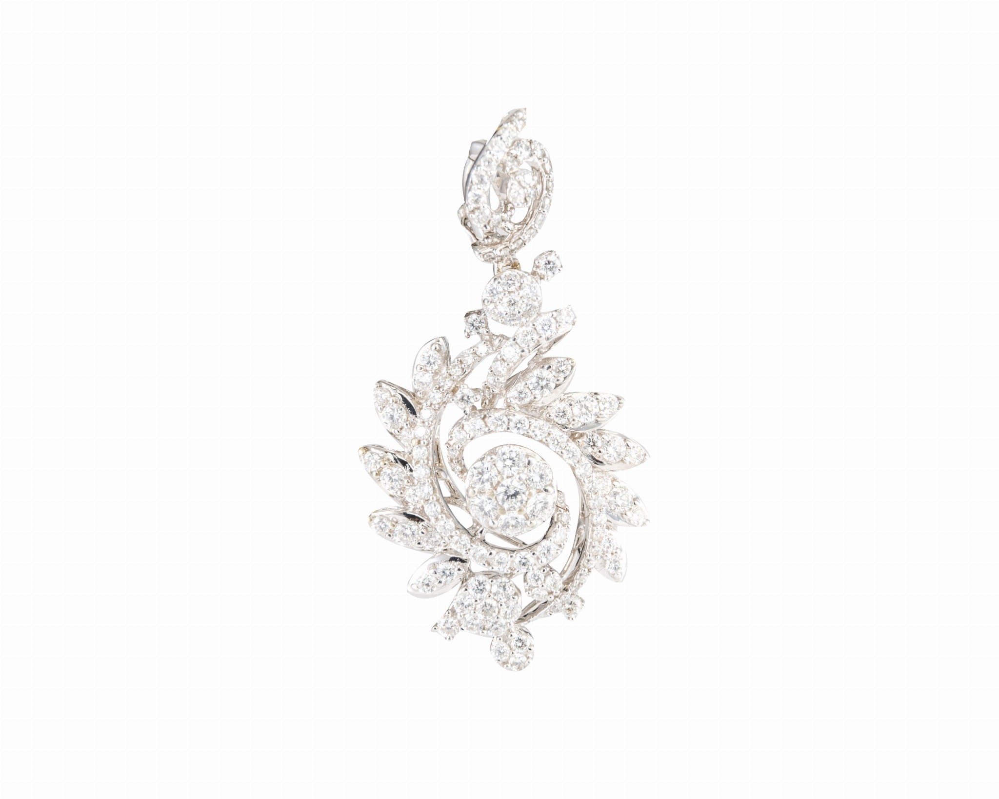 Zawieszka wykonana w białym złocie próby 750, tj. 18 karatowym złocie. Wysadzana łącznie 128 diamentami o łącznej, przybliżonej masie 1 karata, czystości VS i barwie F-G. Zawieszka ma ciekawy kształt z motywem florystycznym.